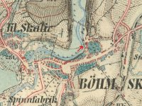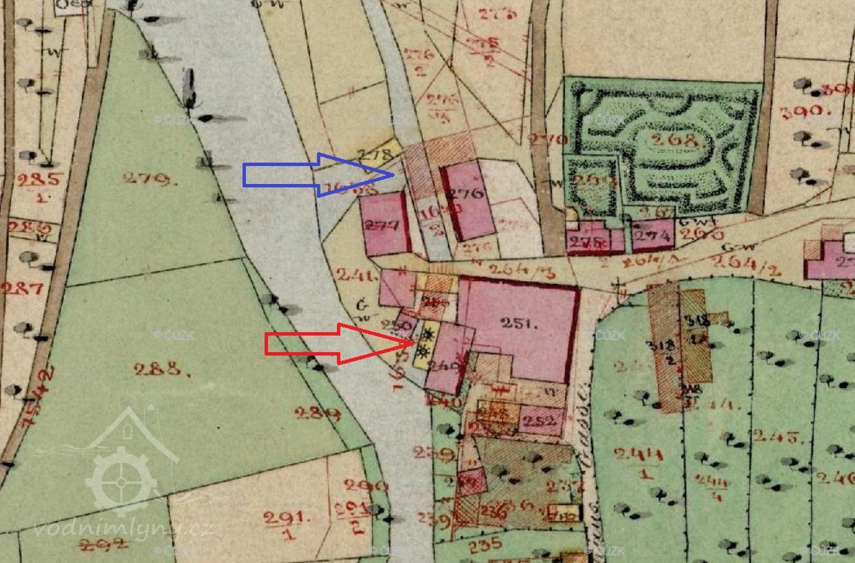 Mlýn vyobrazený již na I. vojenském mapování. 1853 zbořen a nahrazen o 100m výše položeným Novým mlýnem.