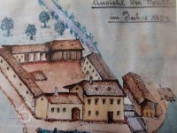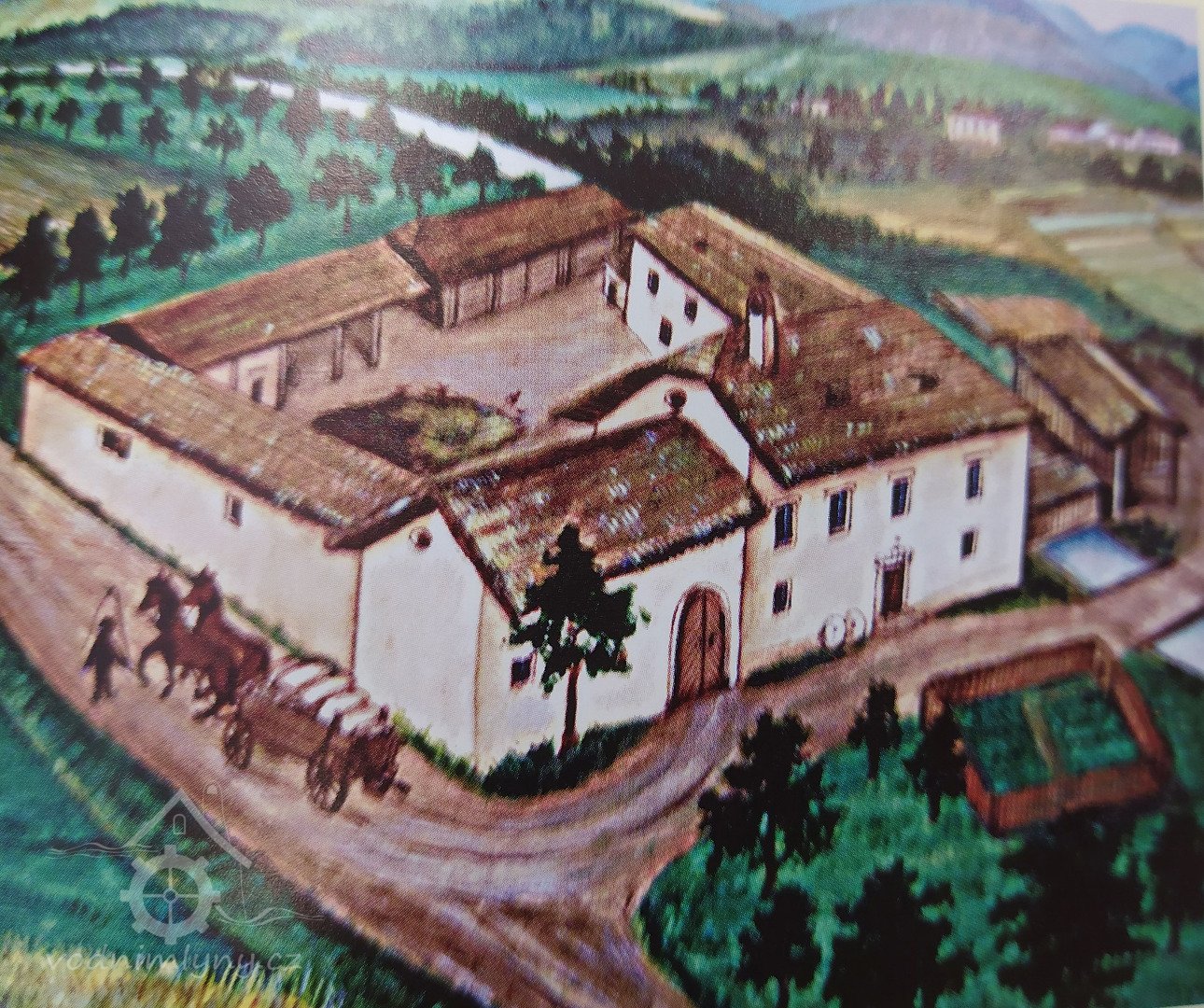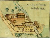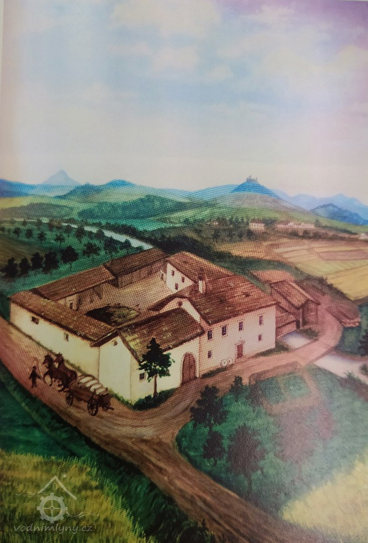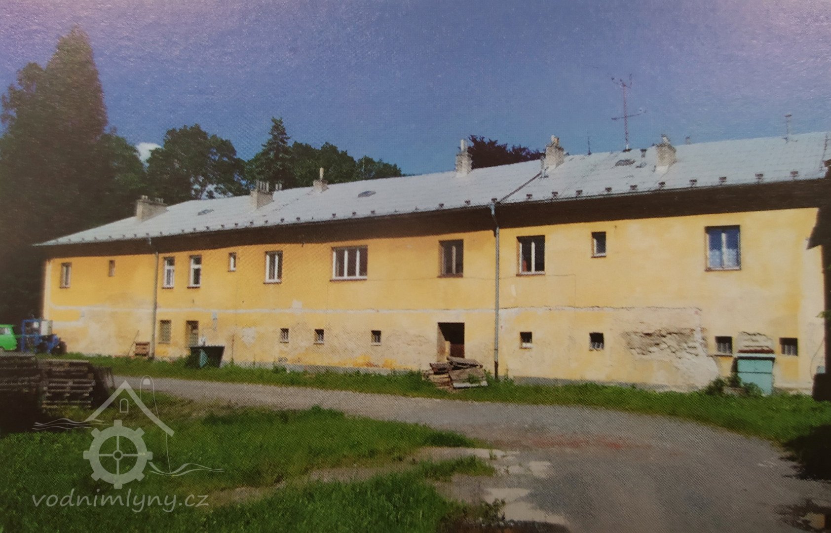 Na západní straně stávala mlýnská budova s bytem, na severu stáj pro 2 koně a několik krav, na východě stodola ze dřeva a nepálených cihel, na jihu komora a opravářský dílna. Všechny budovy měly druhé podlaží, i když nízké a doškovou střechu.