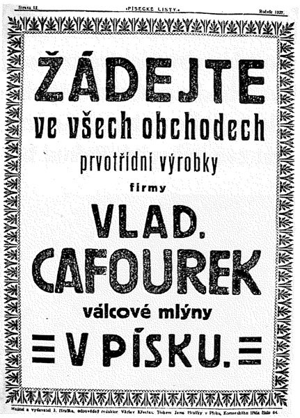 1923 písecké velkomlýny Vladimíra Cafourka a Rudolfa Weila sloučeny v akciovou společnostr s kapitálem 6 mil. Kč. Do volného upisování určeno 2.824 akcií po 400 Kč nom. hodnoty