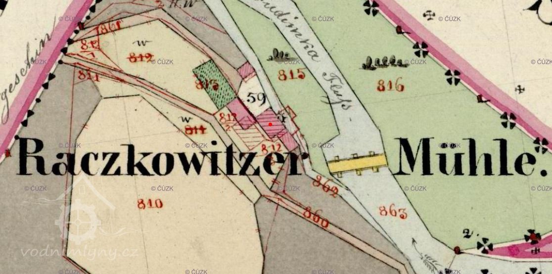 Mlýn byl postaven před rokem 1876 a v té době měl jedno složení poháněné kolem na střední vodu o průměru 440 cm a šířce 89 cm.