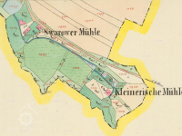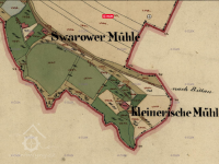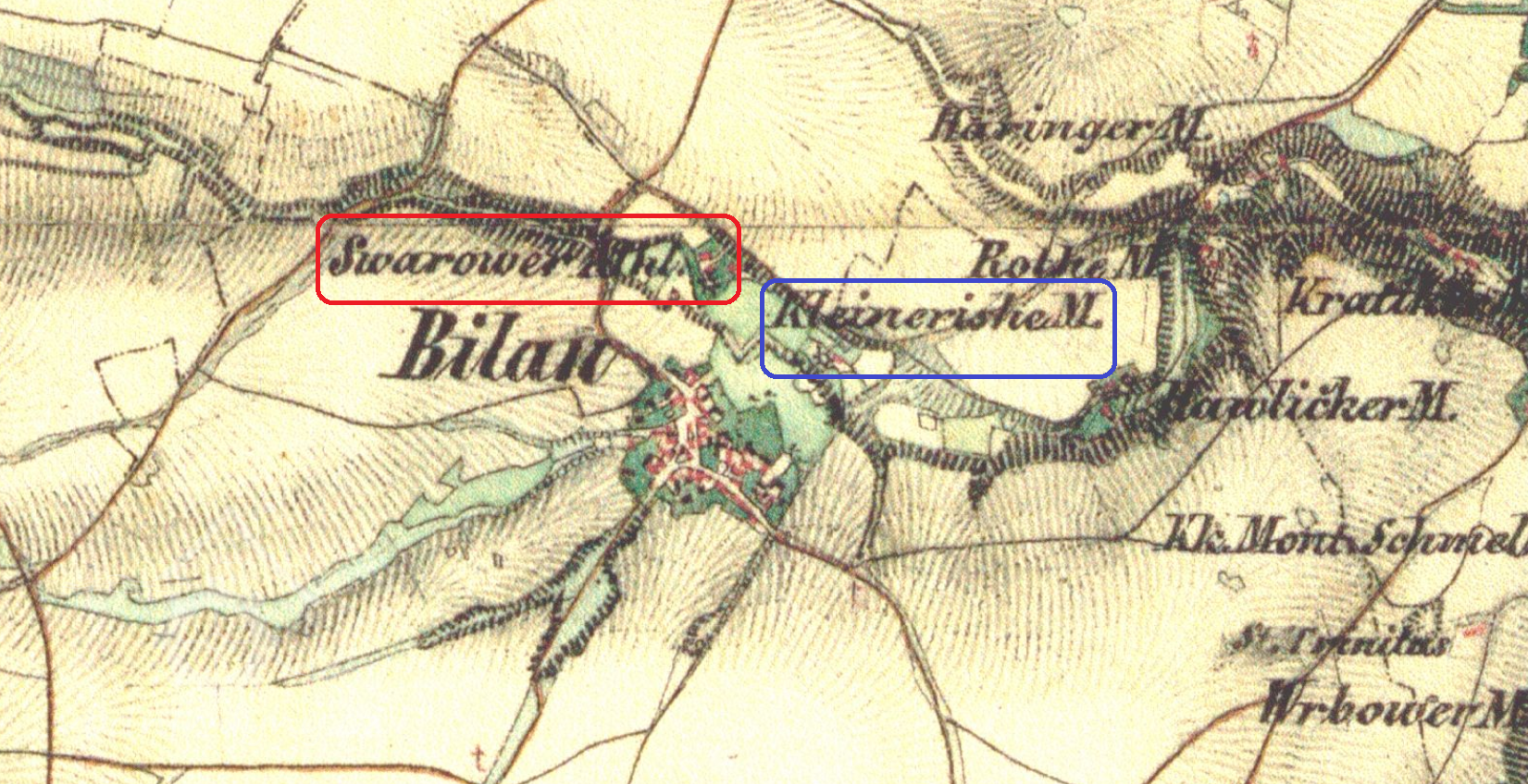Svárovský (červeně) a Kleinerův (modře) mlýn, II. vojenské mapování, výřez, 1836-1852, © oldmaps.geolab.cz
