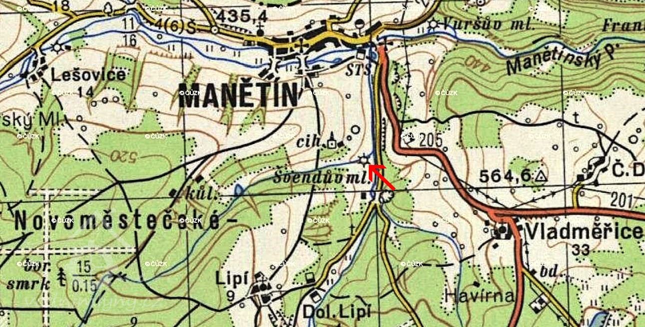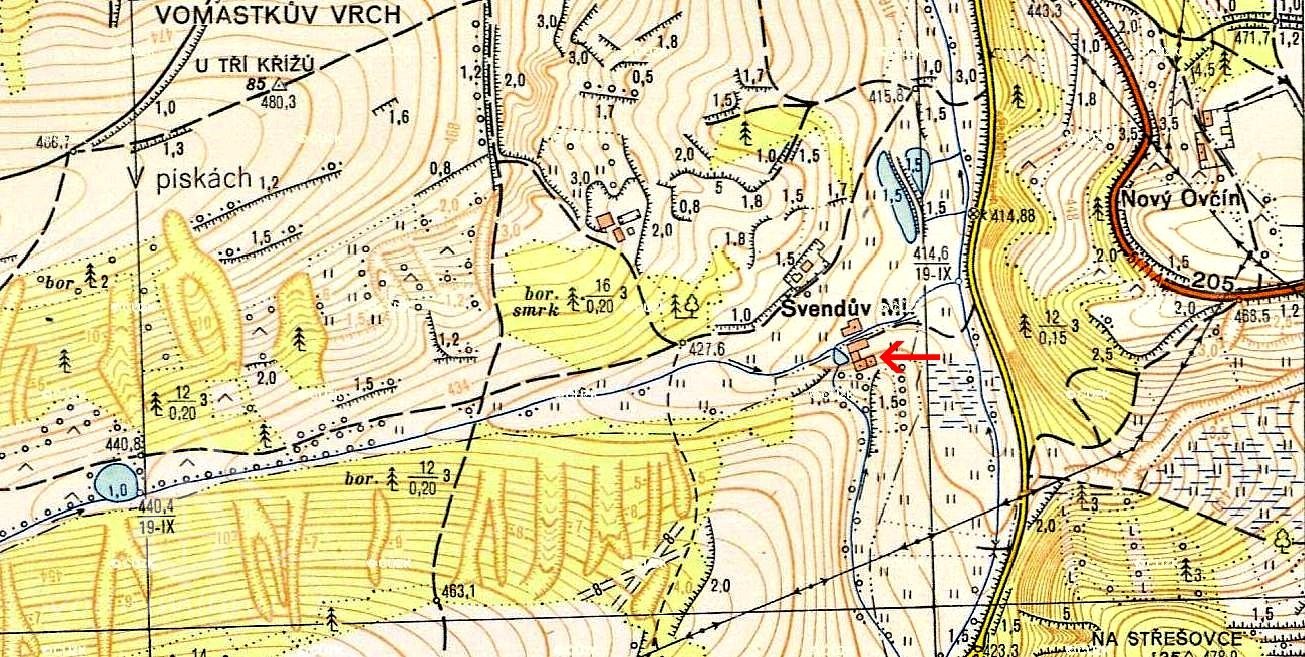 Na obecním pozemku nacestě do Švendova mlýna, zvaného na Vomastkojc, stával dřevěný kříž s plechovým obrazem Krista. V roce 1838 byl velmi zašlý znovu obnoven.