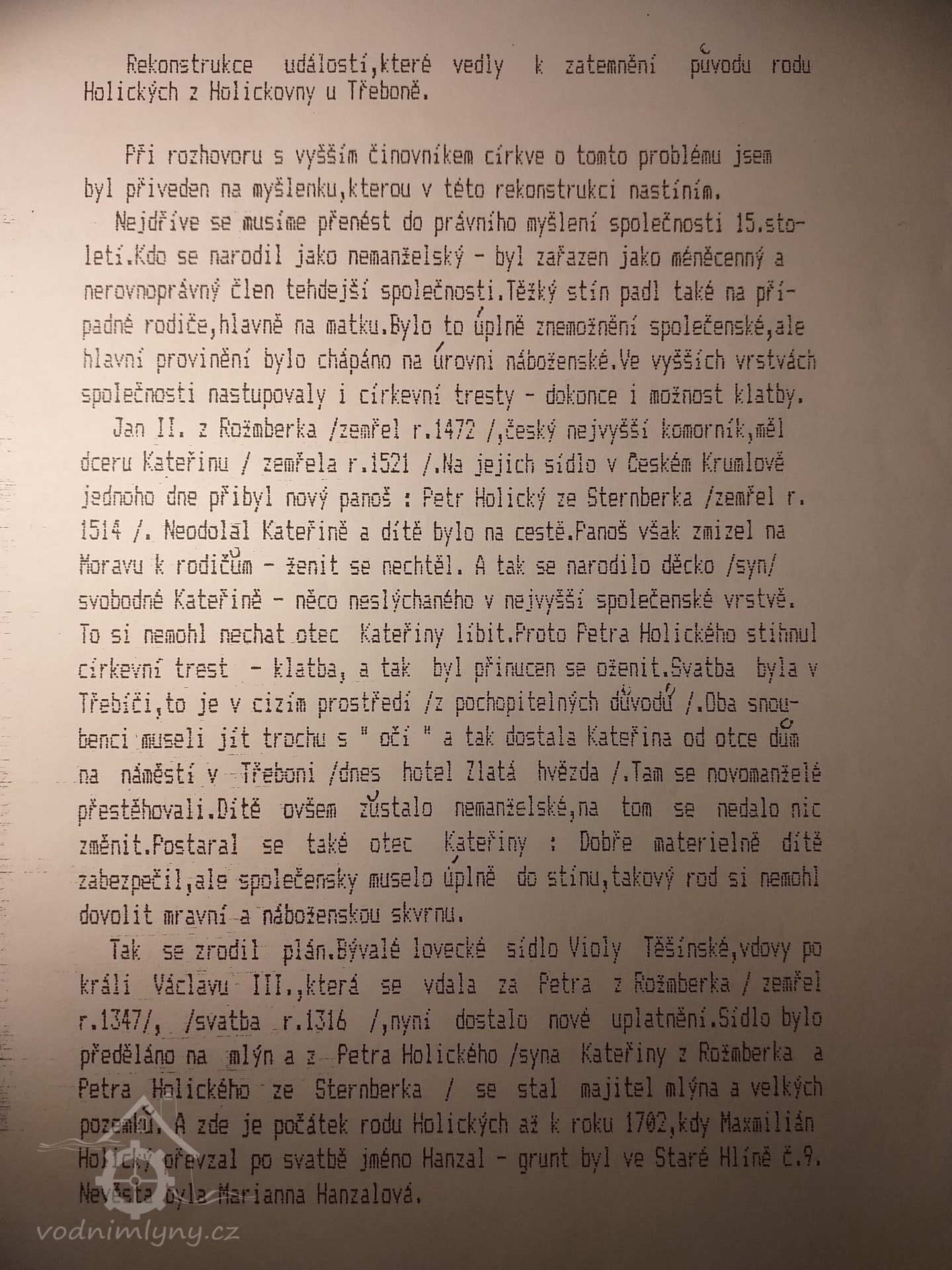 Kolem r.1490 byl z loveckého sídla královny Violy Těšínské zřízen mlýn k obživě Petra Holického(*1471), nemanželského syna Kateřiny z Rožmberka (*17. Srpen 1457, +20. Srpen 1521) a Petra Holického ze Šternberka (*1446, +4. červen, 1514). Petr byl jako nemanželský svěřen do výchovy Anežky z Rožmberka († 25. července 1488) , která žila na Třeboni jako svobodná, kde na zámku hospodařila a dostala na starost nemanželského Petra, porozeného v Českém Krumlově, pro kterého pak byl z loveckého sídla královny Violy Těšínské zřízen k obživě mlýn - Holickovna. Mlýn byl dřevěné konstrukce postaven nad ramenem Lužnice. Zanikl pravděpodobně za třicetileté války. Dvůr byl v držení rodu Holických do r. 1869, ovšem v majetkových a gruntovních knihách z r. 1683, 1728, 1786 atd. již nikde zmínka o mlynáři či mlýnu není.