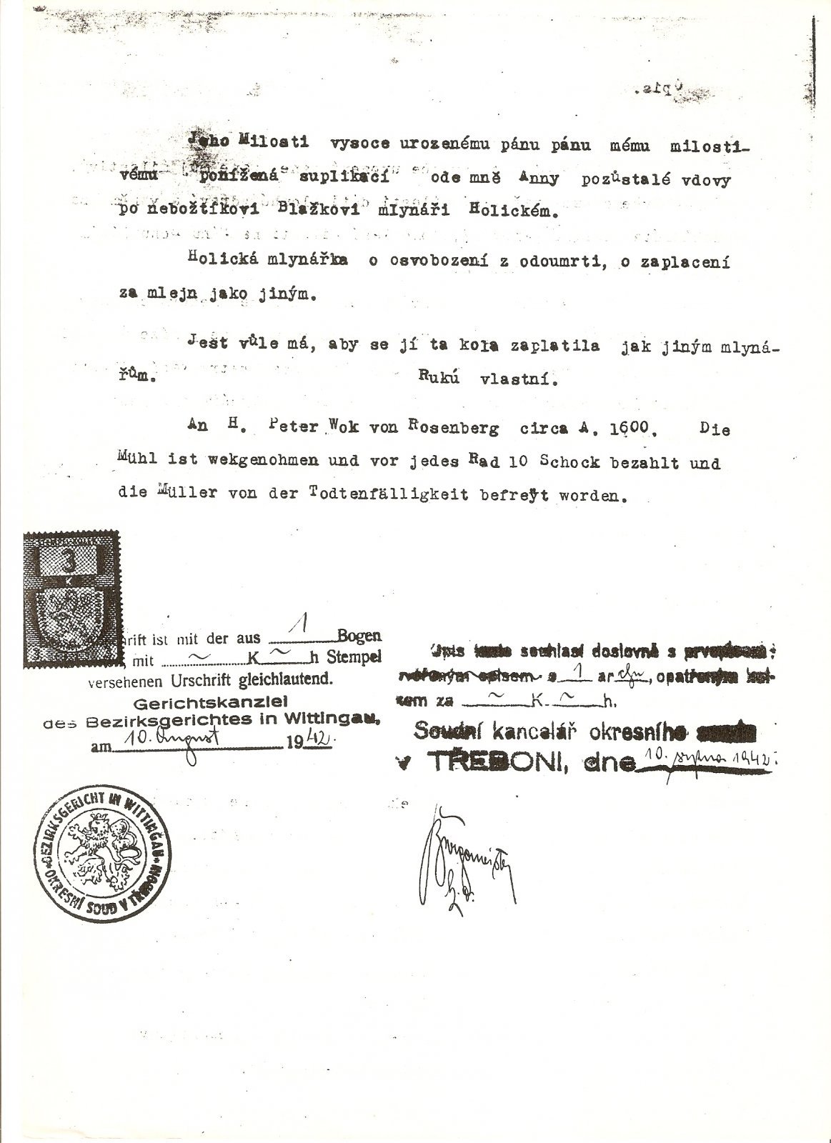 „…Mezi nejkrvavější mlynářské příběhy patřilo zajisté vyvraždění rodiny bohatého mlynáře Holického na Třeboňsku roku 1594. Zajatého mlynáře lupiči mučili, aby jim prozradil,,kde má ukryté peníze. Jejich kořistí se nakonec stala suma 75 kop grošů, ale peníze jim stejně štěstí nepřinesly. V jedné z předměstských krčem v Jindřichově Hradci totiž nedlouho po této události opilí tuláci po sobě začali házet tolary. Toto počínání bylo natolik podezřelé, že záhy přivolalo městského rychtáře s jeho biřici a tuláci skončili v rukách práva. Posléze se potvrdilo, že šlo o část lupičské tlupy, která měla na svědomí mlynáře Holického...“(pep)