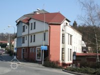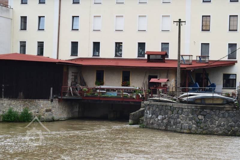 Čtyřpatrová budova se secesními prvky pod splavem na předměstí, upravena pro prodejní prostory.