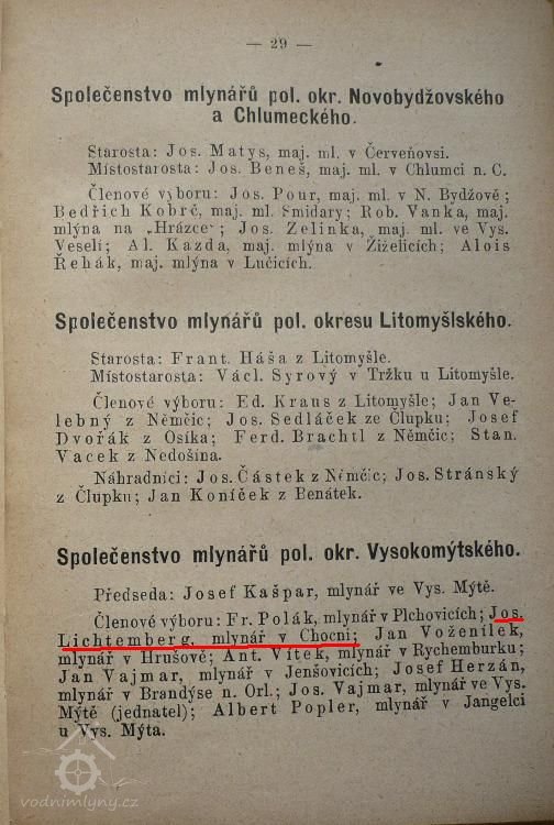 1899 - Jos. Lichtenberg členem výboru Společenstva mlynářů pol. okr. Vysokomýtského (F. Duška, Kapesní kalendář mlýnů česko-moravských, r. 1899) (HŠ)