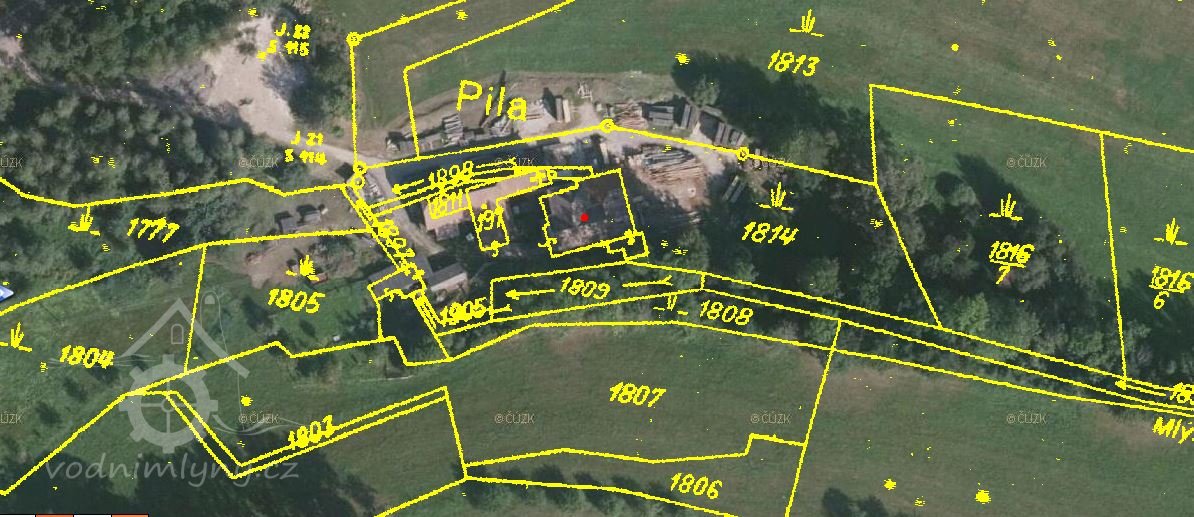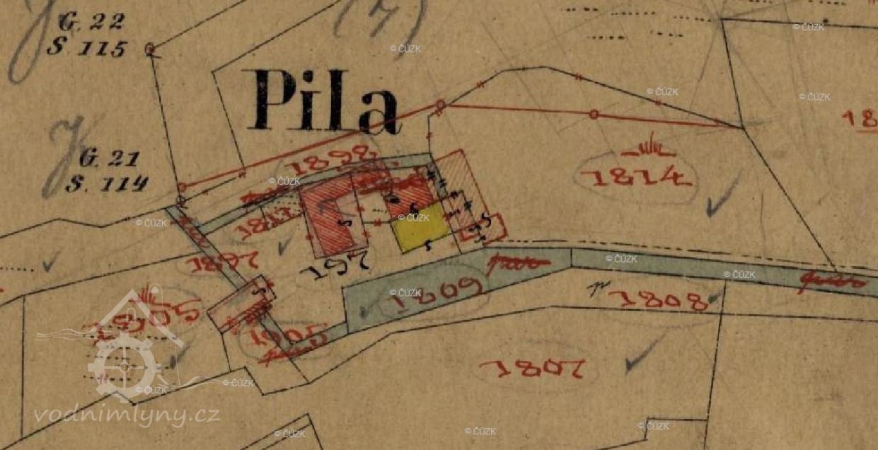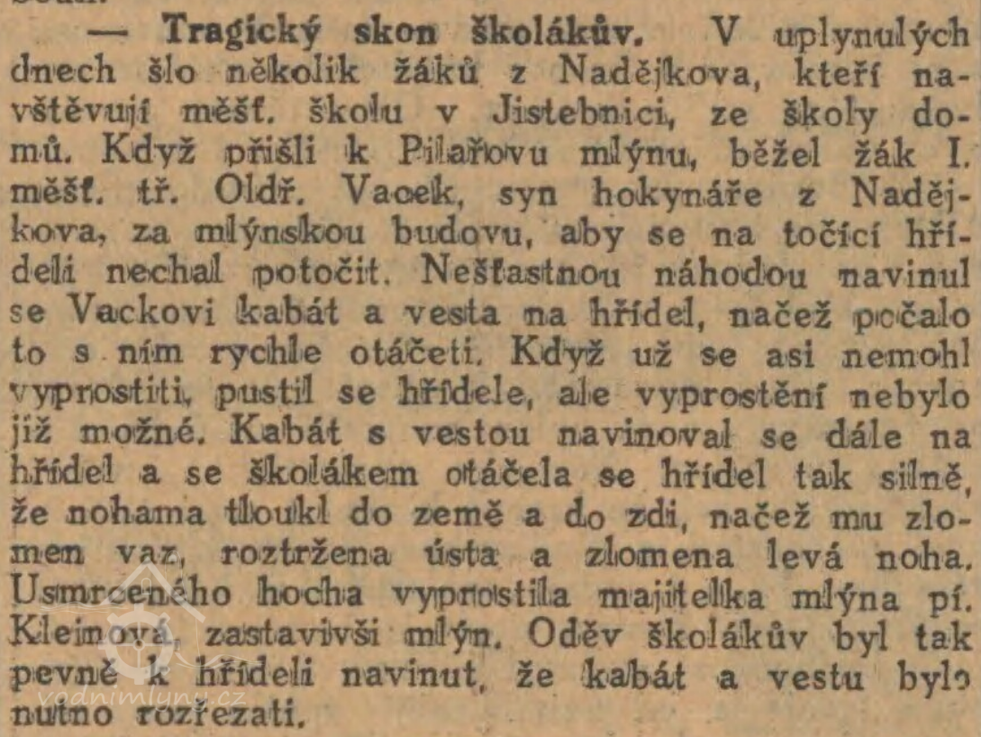 Objekt bývalého mlýna, nyní pily leží u silnice mezi Jistebnicí a Nadějkovem. V sedmdesátých letech 19. století měl mlýn 2 kola na vrchní vodu, která hnala dvě obyčejná složení a pilu. V roce 1928 dostal mlynář Jan Oulehla (v matrikách i Aulehla) povolení k výstavbě Francisovy turbíny na místě mlynského kola o výkonu 10 ks. Oulehlové jsou na mlýně od roku 1852. Před tím zde mlel mlynář Ferdinand Maděra.