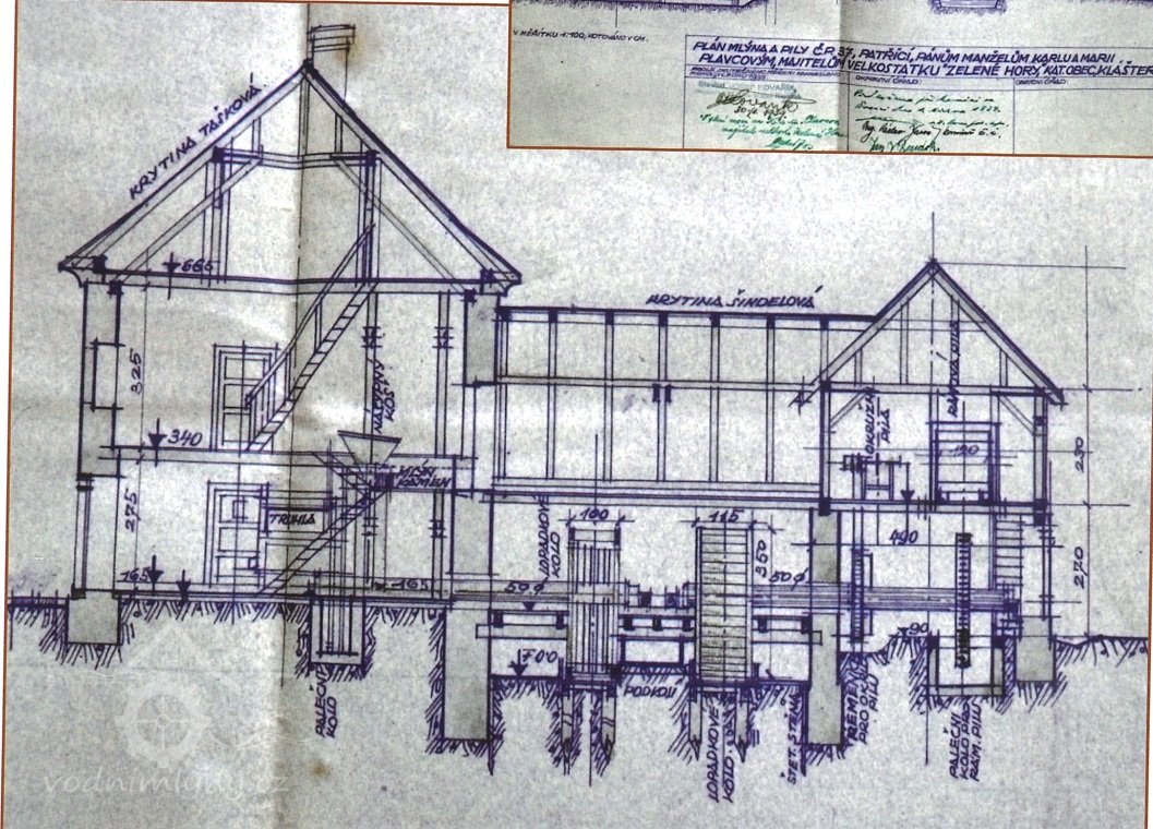 kolo na pilu: prům. 3,6 m, hloubka lopatek 0,3 m, šířka 1,04 m. Hltnost 140 l/s, spád 1,8 m, výkon 2,01 HP.