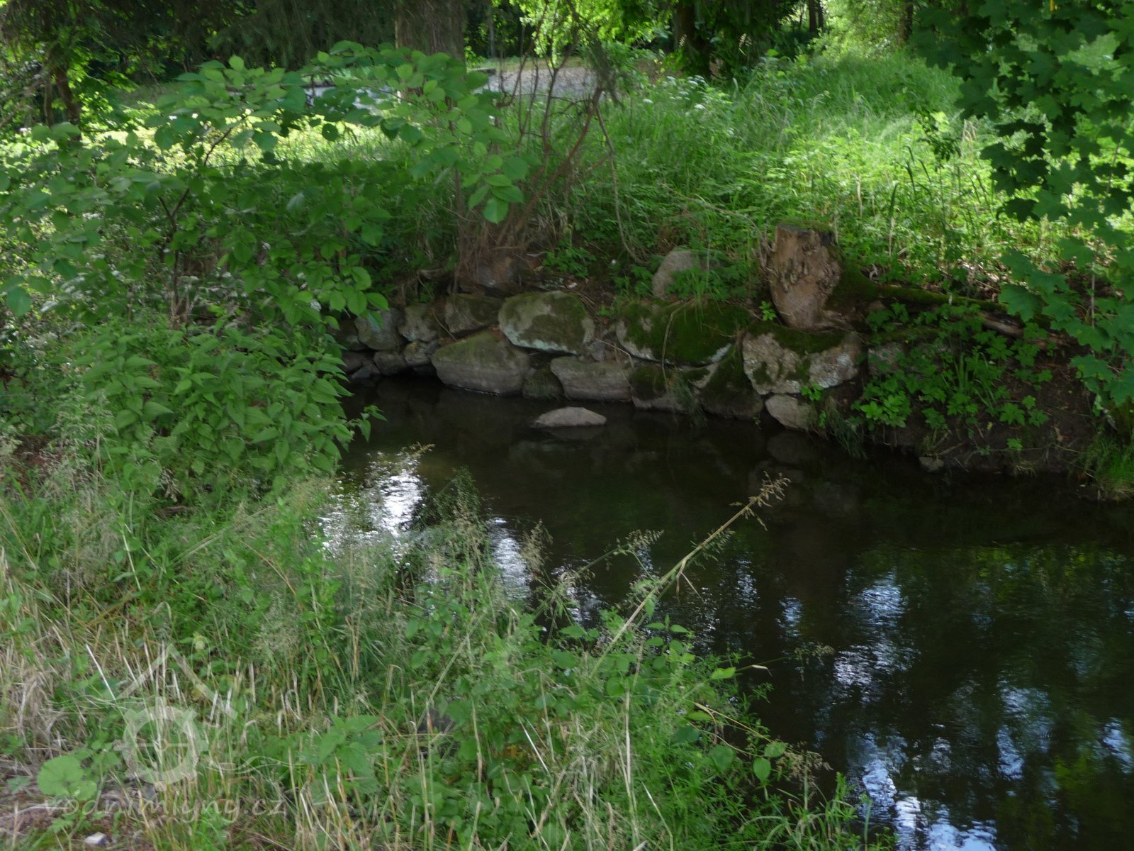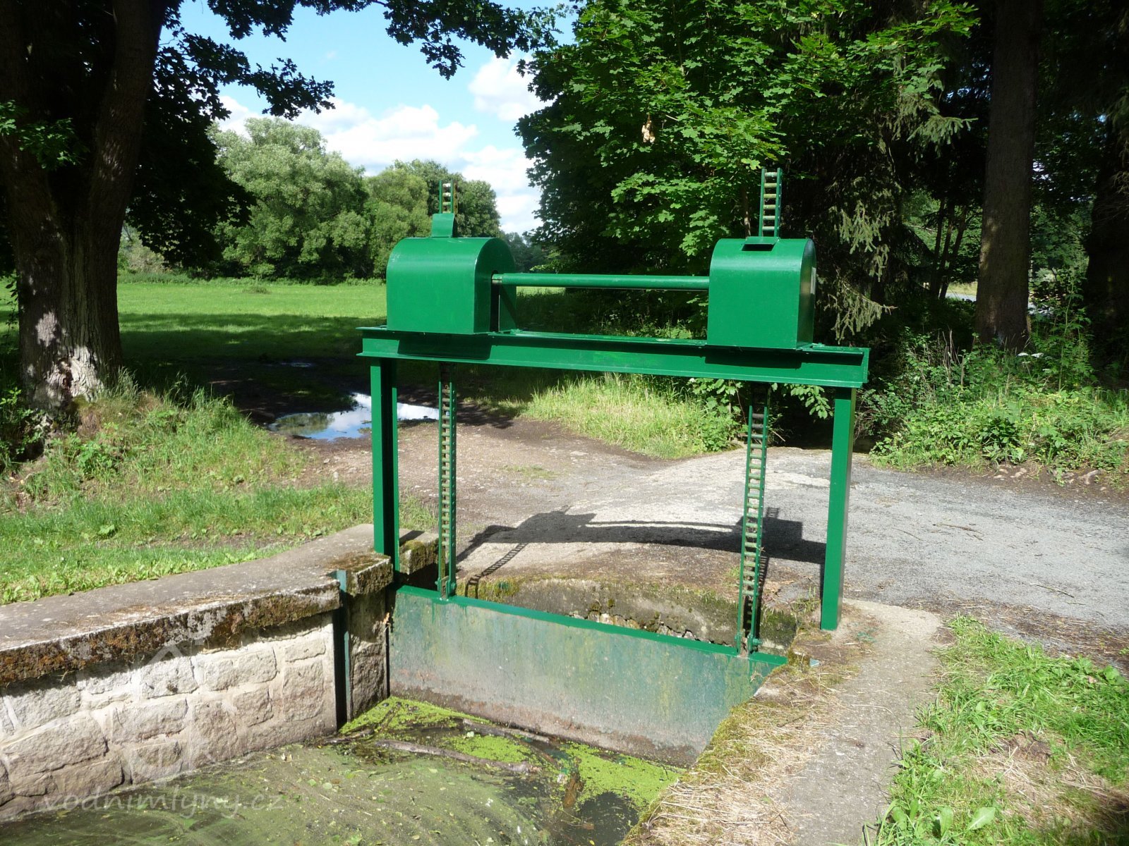 Jez 1300 m nad mlýnem, délka 51,5 m, vzdouvá vodu v šířce 24 m, při vtoku do mlýnského náhonu 2 stavidla, šíře 92 a 94 cm, a stavítka 173 cm vysoká.