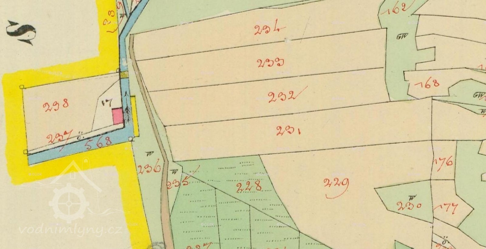 kolo na mlýn: prům. 3,6 m, hloubka lopatek 0,25 m, šířka 0,82 m. Hltnost 92 l/s, spád 1,8 m, výkon 1,32 HP
