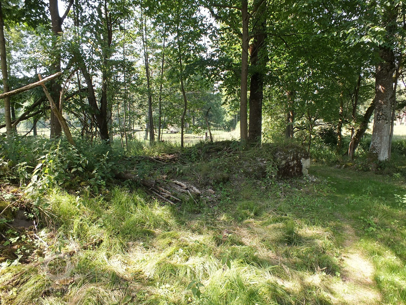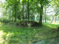 Zaniklý mlýn se zbytky zdiva v terénu.