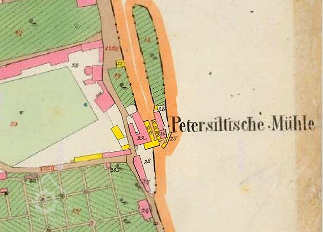Již ve 40. letech 14. stol. stávaly na tzv. Petržilkovském ostrově mlýny zvané kartouzské, patřící kartuziánskému klášteru na Smíchově. Ty však byly r. 1419 vydrancovány a vypáleny husity spolu s klášterem. Po husitských válkách získala ostrov pražská obec