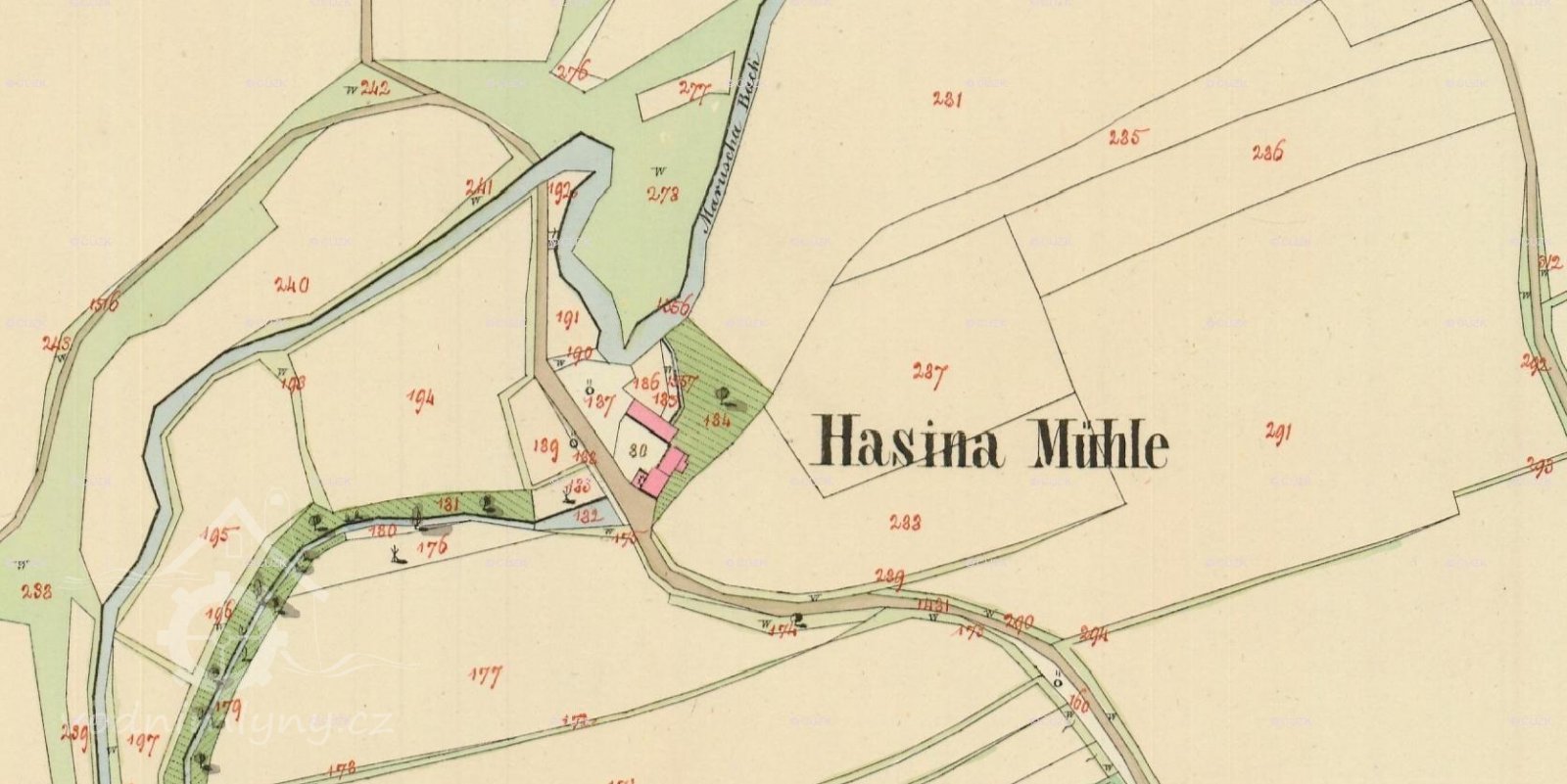 Chátrající mlýn v údolí řeky Hasiny. Vlastník TOSTARDEN a.s., Biskupský dvůr 2095/8, Nové Město, 11000 Praha 1. Fotky doplním časem.