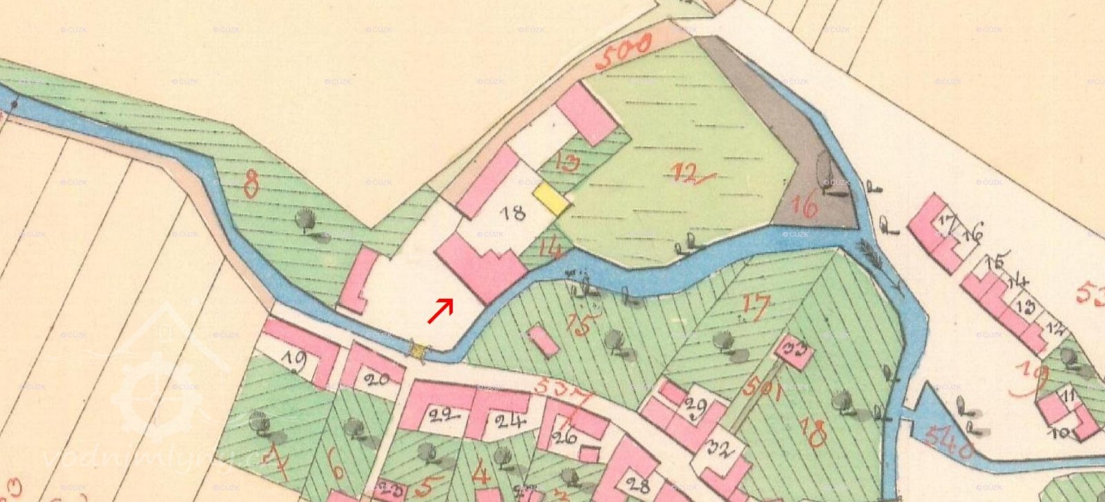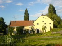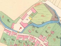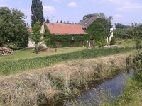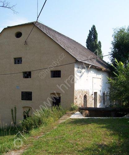 Bývalý vodní mlýn, poháněn vodou shora na Mlýnském potoku, který je upraveným původním pravým ramenem říčky Hloučely.