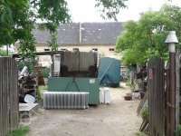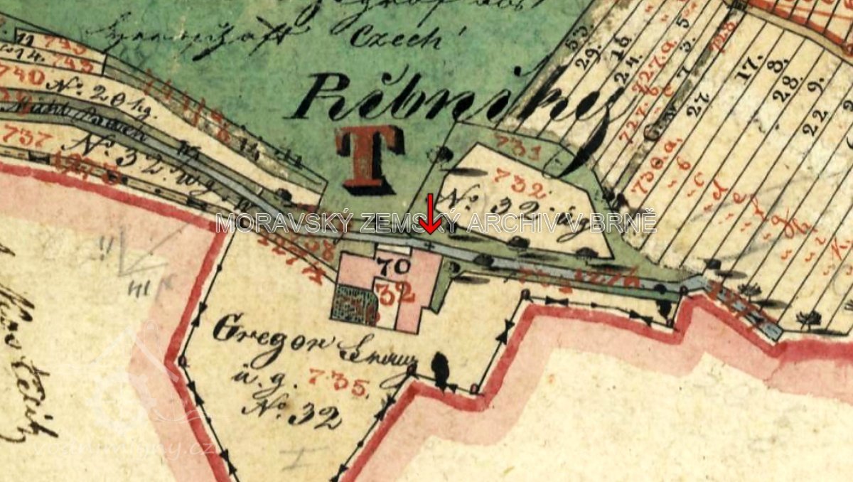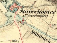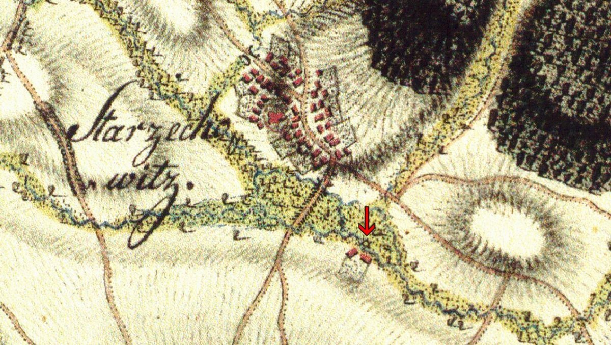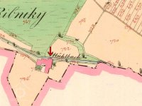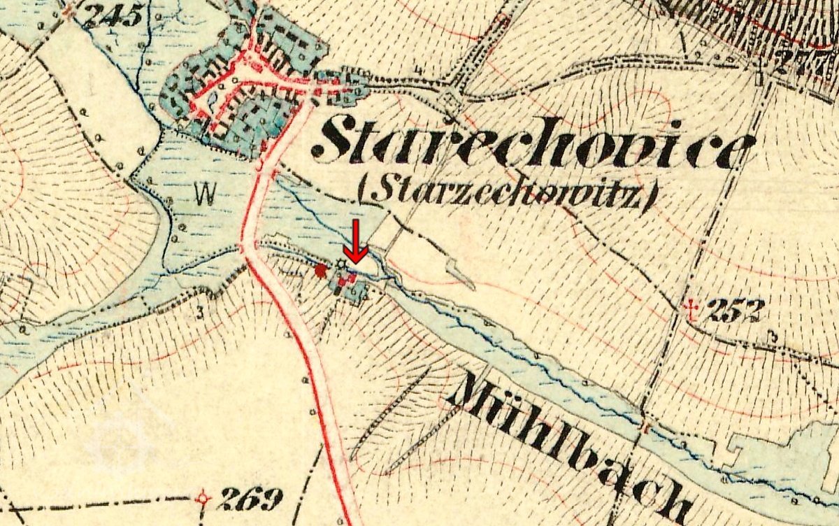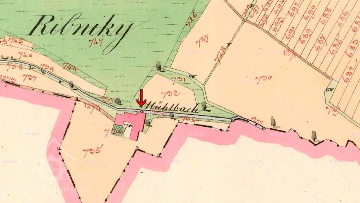 Bývalý vodní mlýn na Českém potoce. Přední bytová budova, za ní hospodářské budovy a mlýn. Dnes je zde výkupna sběrných surovin a byty.