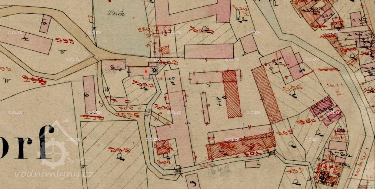 Mlýn stával v areálu vrchnostenského dvora, napájen byl vodou z rybníka, který společně s náhonem tvořil část opevnění původní renesanční tvrze. Mlýn najdeme na všech mapách vojenského mapování. Stojí ještě v roce 1954. Dnes jen zbytky turbínové kašny, odtokový kanál a snad základy lednice.