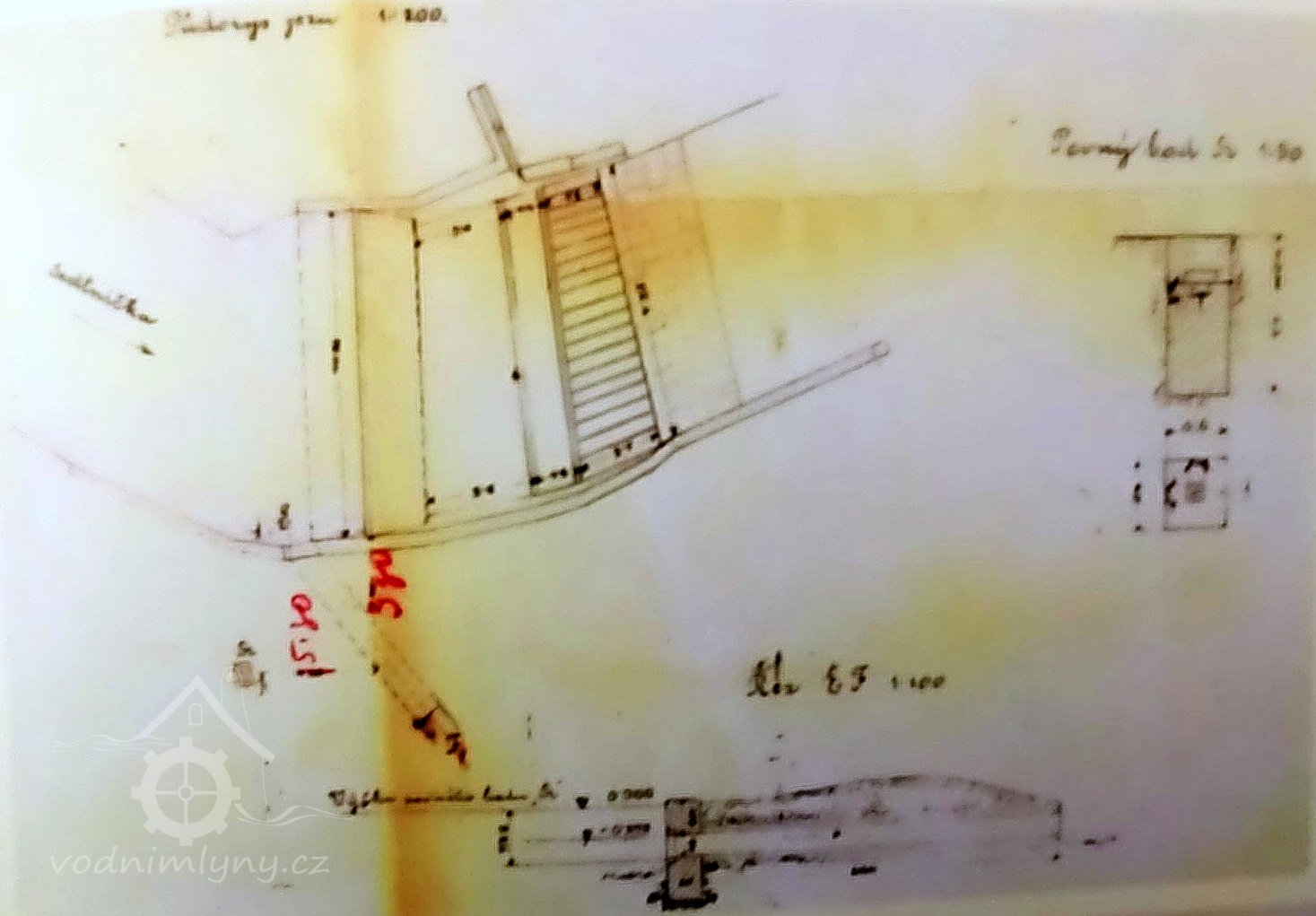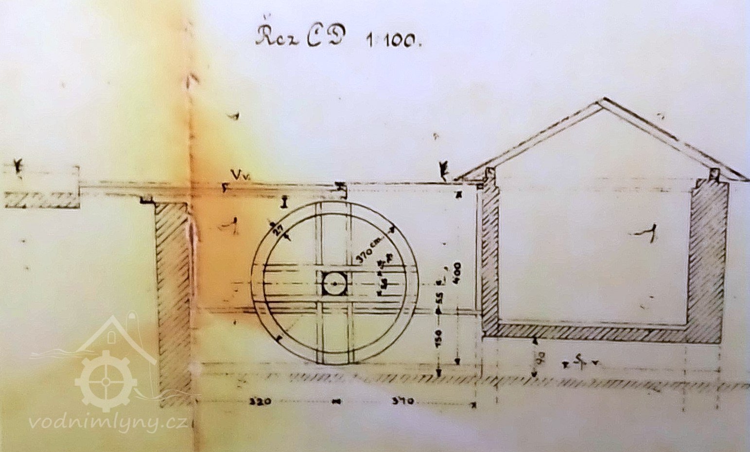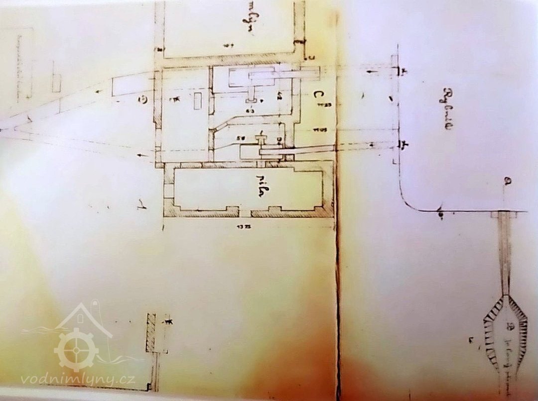 pila s kolem na horní vodu výkon 5,5 HP (4,07 kW), hltnost 0,15 m3/s a spád 4,25 m