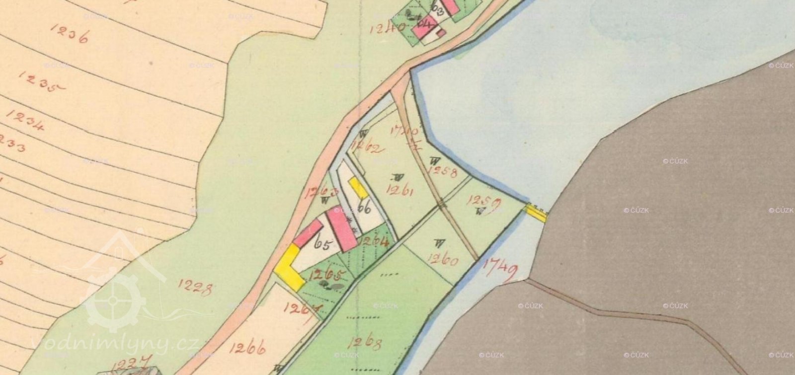 PopisV roce 1930 pohání mlýn a pilu dvě kola na svrchní vodu s průtokem 0.108 a 0.167 m3/s, spádem 4.72 m o výkonu 11.25 HP.
