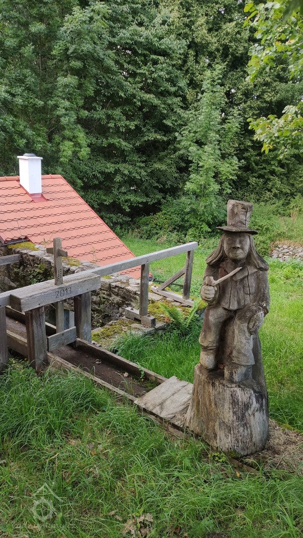 Pěkně opravený vodní mlýn s vodním kolem pod hrází rybníka Krajíc.
