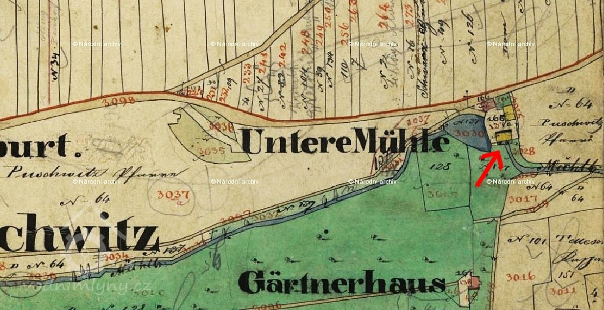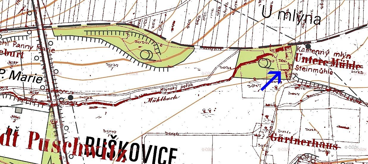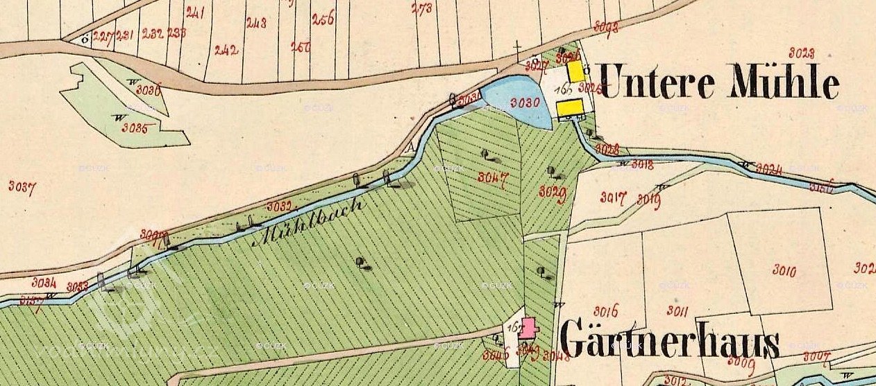 PopisV roce 1930 zde bylo vodní kolo na vrchní vodu o hltnosti 63 l/s, na spádu 5,2 m a výkonu 2,8 HP.