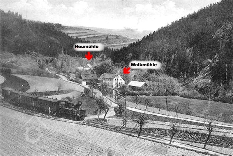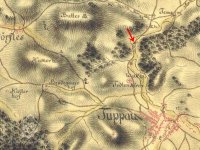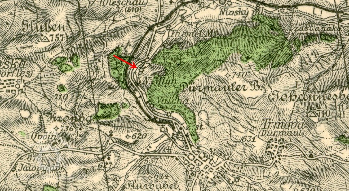Mlýn se nacházel asi 1,8 km SZ od centra zaniklé obce Doupov.