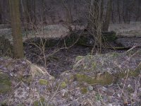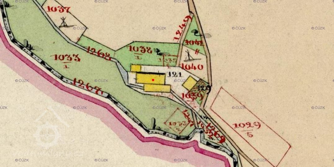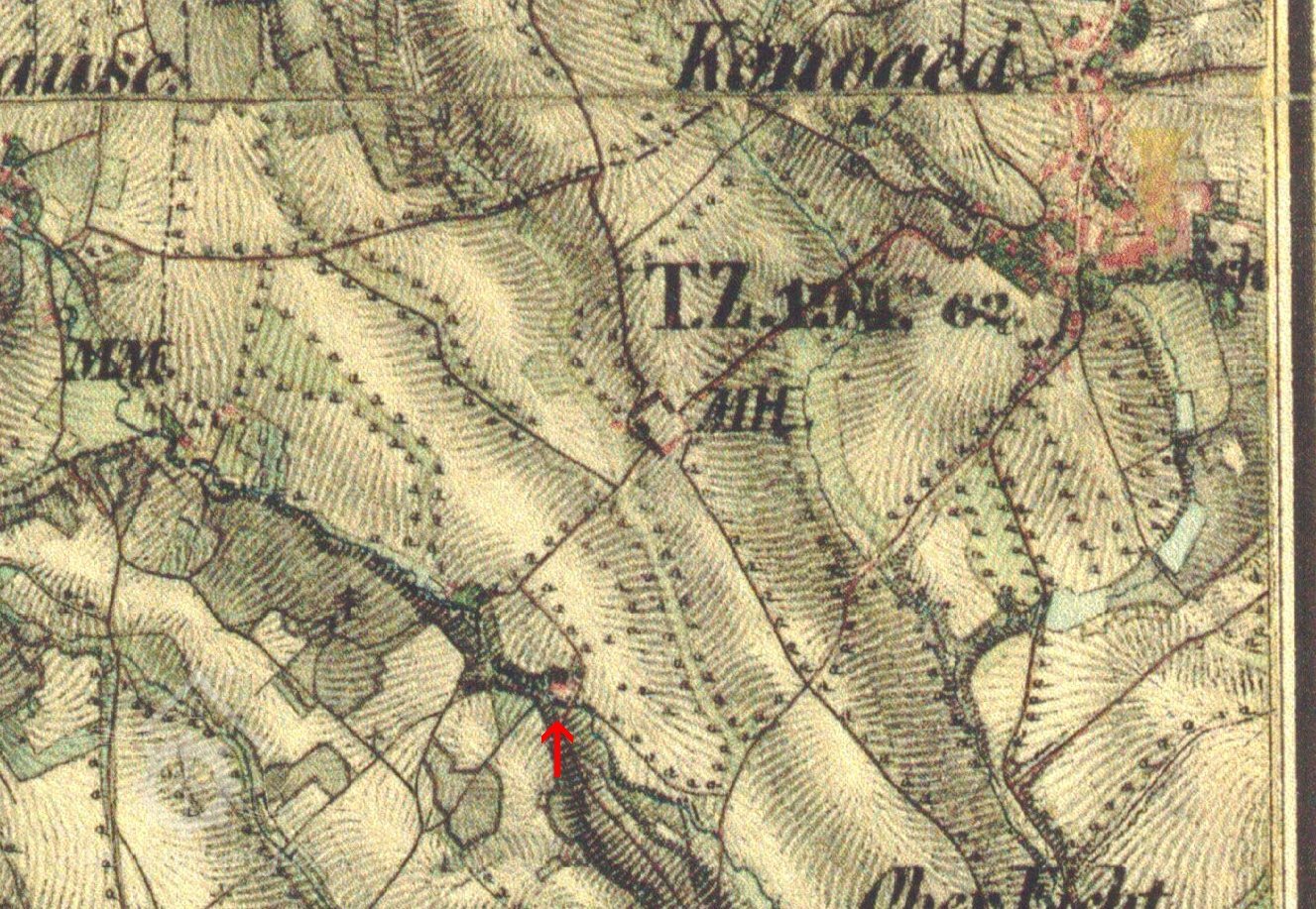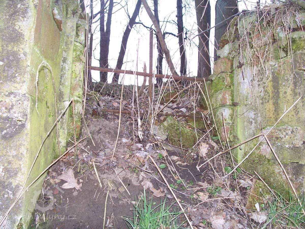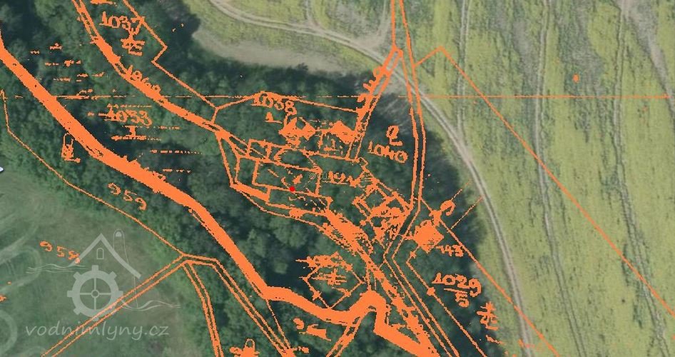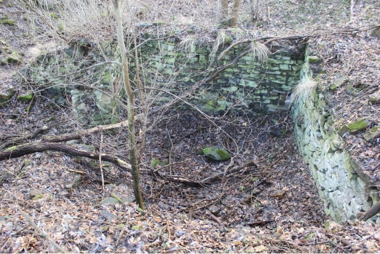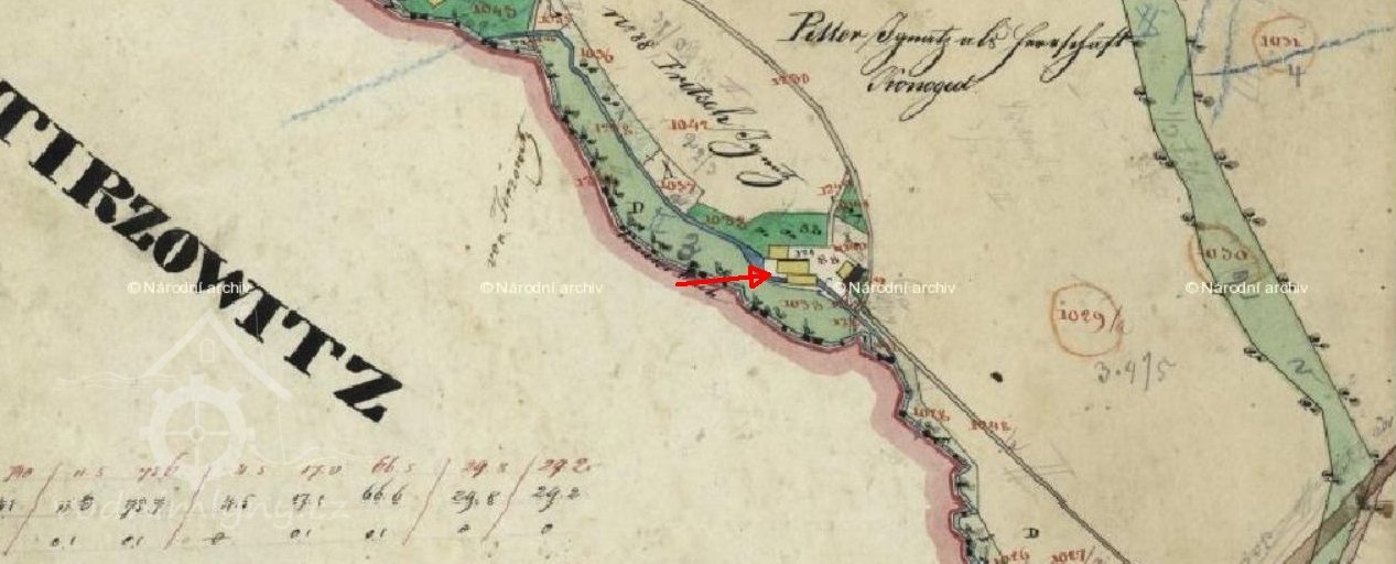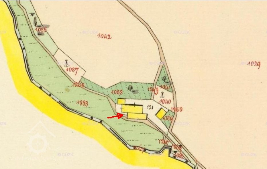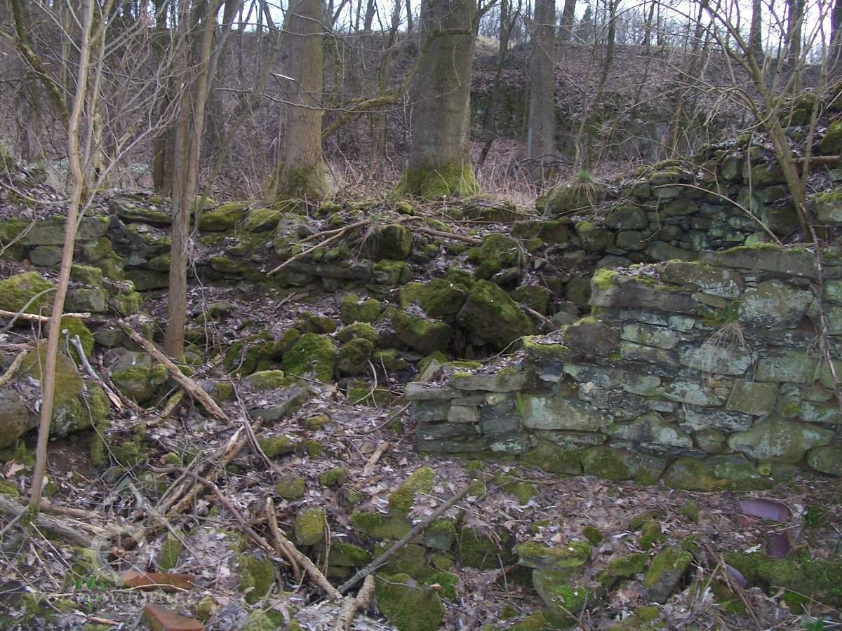 "Na indikačních skicách stabilního katastru lze identifikovat usedlost se třemi spalnými budovami. Jejich hlavní průčelí jsou orientována k příjezdové cestě od severu. Stavba umístěná nejjižněji se nachází nad vodním tokem a vede k ní náhon. Ve východní části vymezené parcely jsou další dvě budovy, spalná a nespalná. Tyto stavby jsou natočené okapovými průčelími k severozápadu a jihovýchodu. V současné době jsou dochovány v reliktech obvodových zdí, části náhonu, lednice, odpadního kanálu, klenutého mostku a studny." citace ze sborníku Terra sacra incognita, str.78.