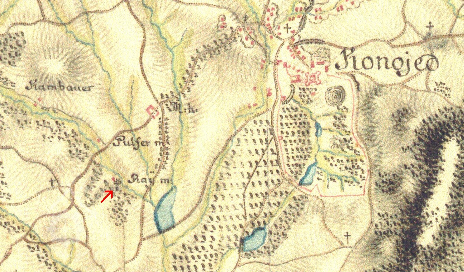 Nejstarší dohledatelná zpráva o mlýnu zvaném Kahnmühle pochází z druhé poloviny 17. století. Byl vystaven jihovýchodně od poplužního vrchnostenského dvora Grosser Mayerhof. Zaniklý areál obilního vodního mlýna a pily se nachází v jihozápadní části extravilánu 1,3 km od obce na toku Úšteckého potoka. Na mapách stabilního katastru z roku 1843 lze identifikovat usedlost, která byla tvořena obytnou a hospodářskou budovou o třech srostlých křídlech. Jejich hlavní průčelí bylo orientováno k severu do dvora. Dům získal při probíhajícím číslování v roce 1771 číslo popisné 88. Od roku 1798 začal být mlýn nazýván jako Raymühle. Mlýnský areál v průběhu let měnil nejen své majitelé, ale také svou podobu, kdy především docházelo k rozšíření. K roku 1946 se areál skládal ze šesti budov. Naposledy se mlýn uvádí jako funkční v roce 1947. Předpokládaný zánik provozu je mezi lety 1947–1954. Postupné chátrání celé usedlosti vedlo v roce 1964 k celkové likvidaci. V současné době se dochovaly pouhé relikty obvodových kamenných zdí, dále části náhonu, mlýnské lednice, odpadního kanálu, klenutého mostku a studny.
