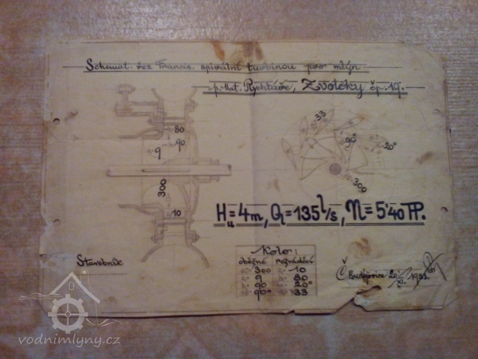 PopisV roce 1930 mlýn pohánělo 1 kolo na svrchní vodu, průtok 0.127 m3/s, spád 3.9 m, výkon 5.2 HP.(LR)