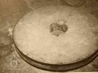 Přírodní mlecí kámen běhoun západoněmeckého typu o prům. 115 cm - větší průměr, malá výška, obruče