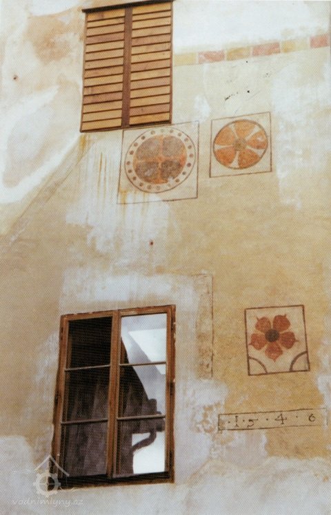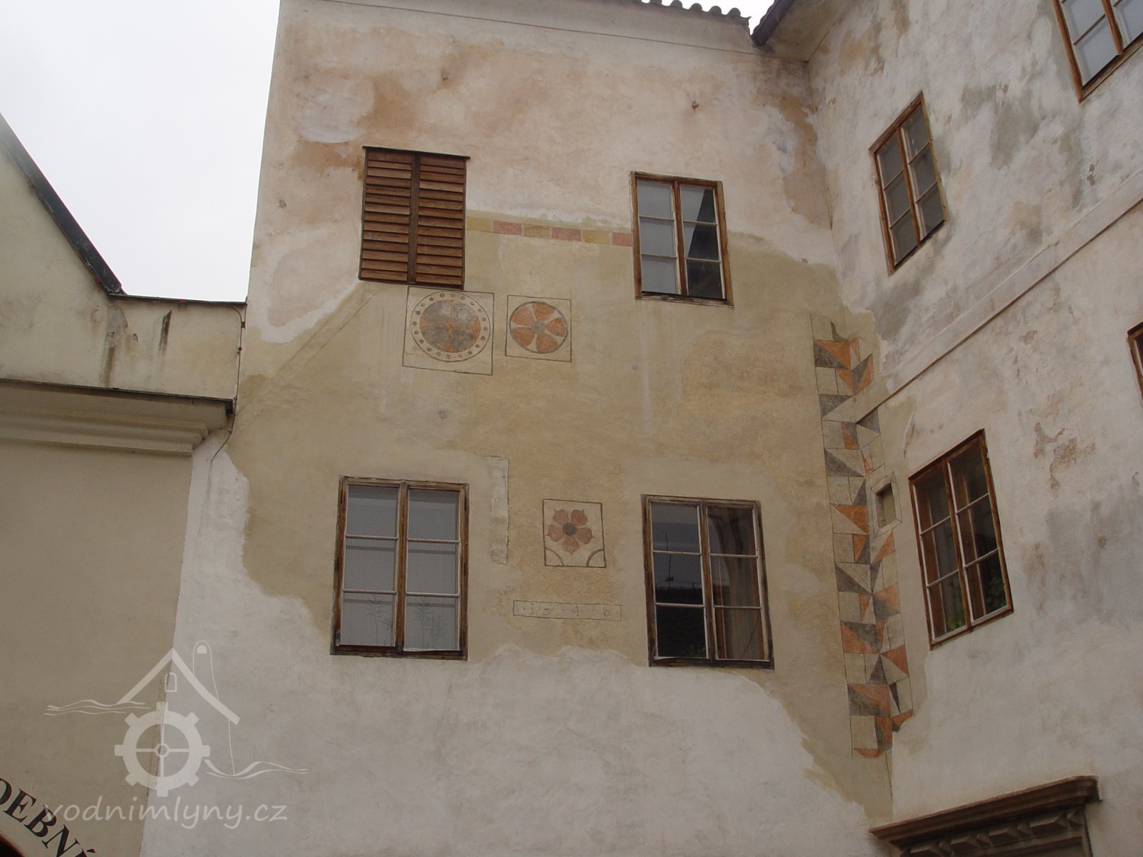 Při opravách vnějších omítek odkryta nástěnná malba stylizovaného mlecího kamene a znaku Rožmberků s letopočtem 1546