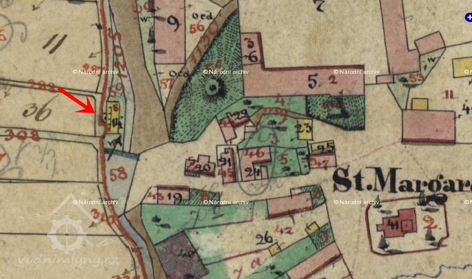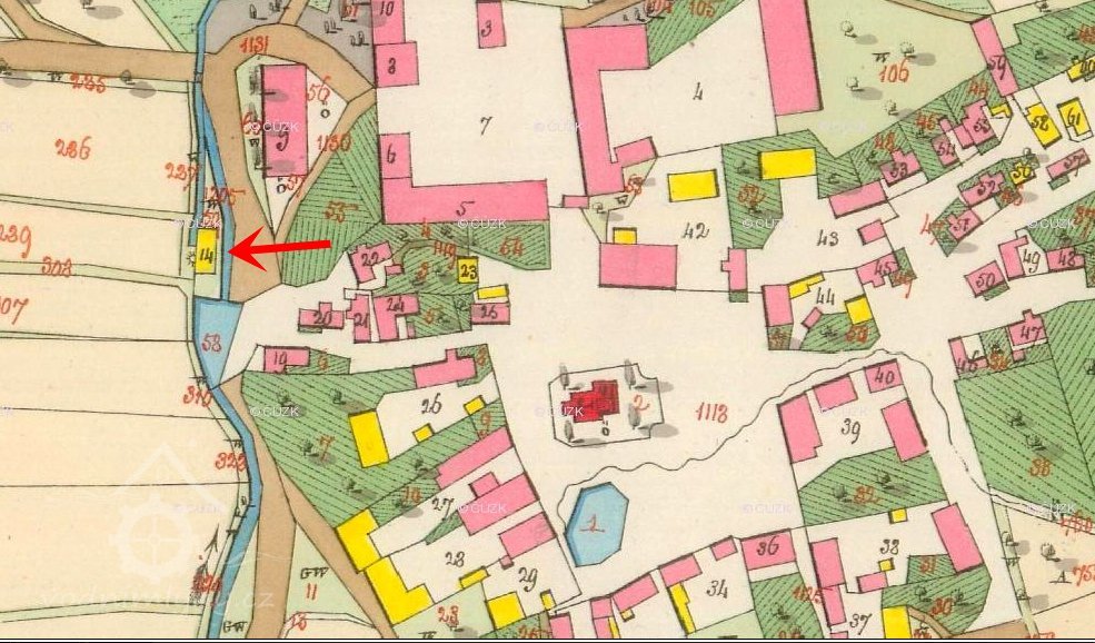 PopisV roce 1930 zde bylo vodní kolo na vrchní vodu o hltnosti 71 l/s, na spádu 4,8 m a výkonu 2,98 HP.