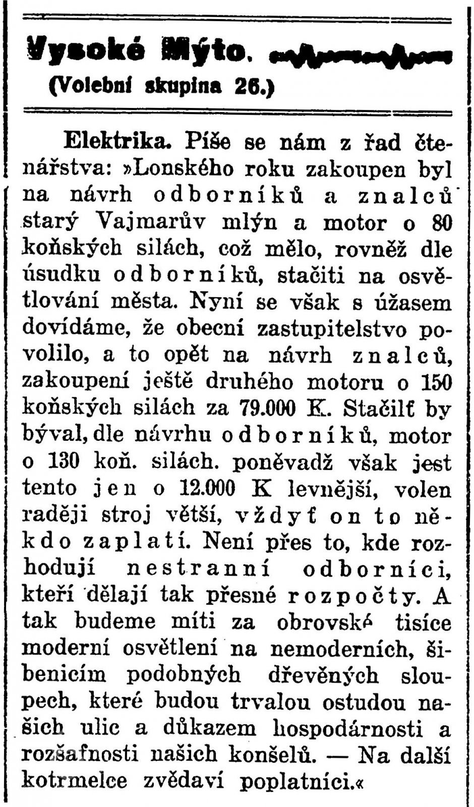 Osvětlování elektřinou vyráběnou vlastním dynamem již v roce 1895. Ze svého mlýna zároveň mlynář Vajmar dodával elektřinu svému švagrovi do hotelu Zlatá hvězda na vysokomýtském Pražském předměstí, kde asi do roku 1908 poháněla také elektrickou ventilaci.
