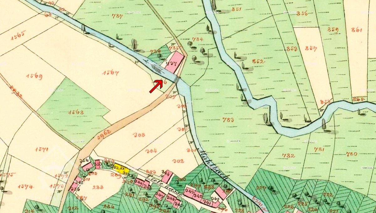 Na tomto místě pravděpodobně stával mlýn zvaný Nejspodnější, 1435 zmíněna část zahrady u Nejspodnějšího mlýna.