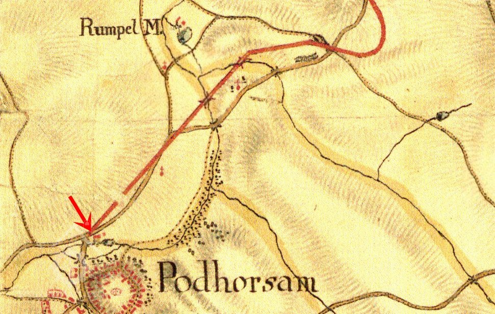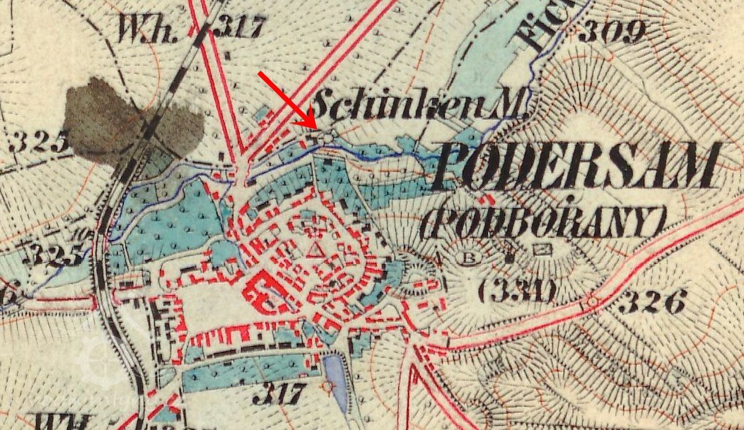 Mlýn se nacházel asi 250 m severně od kostela sv. Petra a Pavla.