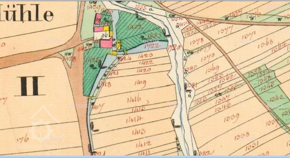 Dle archivních map www.cuzk.cz vedl k mlýnu náhon, který začínal ve středu obce.
