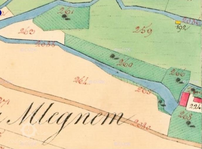 Mlýnský náhon se dá vystopovat pomocí katastrální mapy. Mlýn byl poháněn kolem.