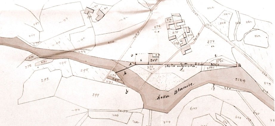 Stavení na kámen neb na cihly postavit, těžkou proti ohni bezpečnou krytinou pokrýt a veškerá ustnovení stavebního řádu zachovat. Plavba dříví na řece Blanici a sousedi vaši nesmí žádnou škodu neb újmu trpěti. Za tou příčinou budiž hlavní práh, který do řeky od začátku stoky až k ostrovu v řece a odtud šikmo až k protějšímu břehu vložiti hodláte, vodorovně tak hluboko v řečišti zapuštěn, aby jeho vrchní plocha ležela v rovnosti s nejhlubším místem oného dílu řečiště, v který se položí. Na ten práh jehlemi upevněný můžete k hražení vody postaviti prkna 6 palců vysoká, malými kůlky tak upevněná, abyste je při velké vodě neb plavbě dříví odstraniti mohl. Krom toho se vám ukládá po celý čas plavby dříví práci v hamru zastaviti a stoku stavidlem úplně zahraditi. Stoka se musí vydlážditi a tarasem z obou stran jakož stavidlem na začátku ve zdi zapuštěným opatřiti. Podél stoky nesmíte žádnou hráz z kamen, dříví neb země či křovím jakýmkoliv způsobem zříditi. Též vám náleží můstky přes tuto stoku potřebné na svůj náklad postaviti a vžy v dobrém stavu držeti. Jakmile hlavní práh položíte, oznamte toto c.k. okresnímu úřadu, aby se znamení normální zasaditi mohlo.