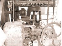 v dílně třírychlostní vrtačka, dvoukotoučová bruska a soustruh, poháněné transmisí