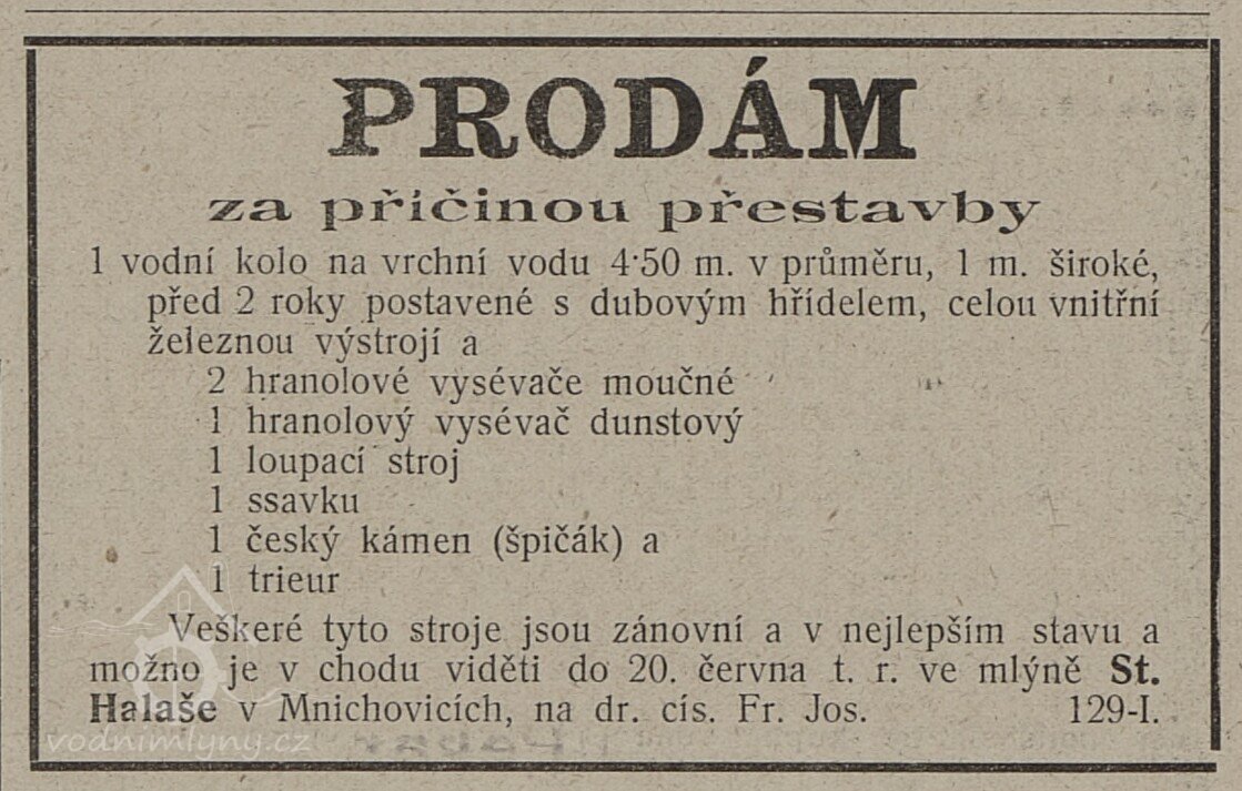PopisV roce 1930 byla ve mlýně 1 Francisova turbína, hltnost 0,225 m3/s, spád 6,3m, výkon 14,3 HP.