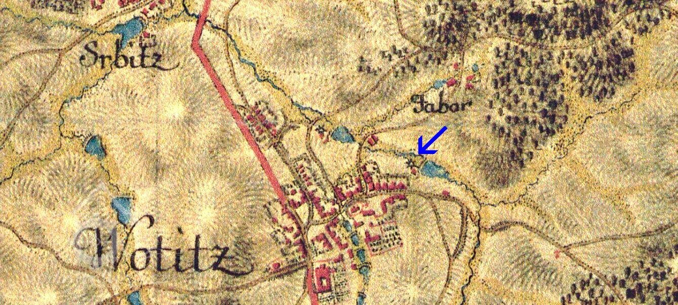 Mlýn se nacházel východně od kostela u židovského hřbitova.