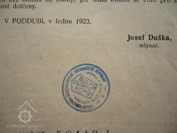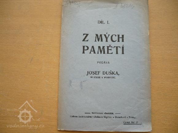 V roce 1923 byl mlynářem Josef Duška, který v tomto roce vydal vlastním nákladem v Benešov knížku Z mých pamětí I.díl viz Ostatní. Scan úvodní stránky a datace poskytla Jitka Filipcová-Dušková.