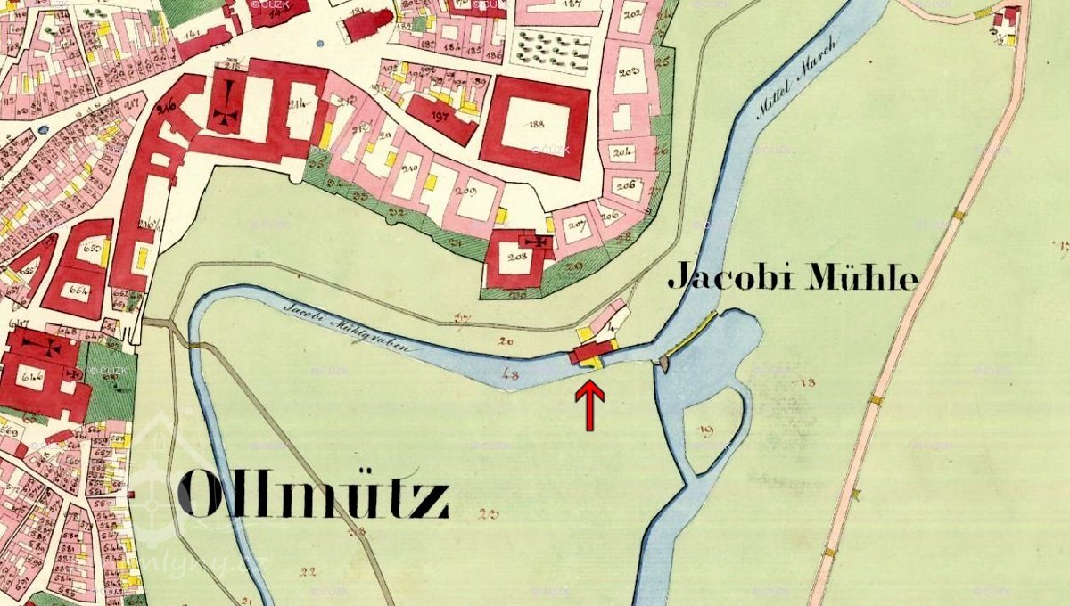 První písemnou zprávu o Jakubském mlýně máme z r. 1213, kdy biskup olomoucký Robert dává spolu s jiným majetkem klášteru sv. Petra i mlýn na řece Moravě. Další zmínka o mlýně pochází z r. 1262, kdy probošt Herbord, představená Magdalena a celý konvent kláštera sv. Petra, pronajali tento mlýn emfyteutickým právem olomouckému měšťanovi Jindřichovi. V listině se zároveň uvádí, že v případě, že by Jindřich vybudoval v těsné blízkosti dosavadního mlýna mlýn nový, má i tento patřit klášteru. Mlynář byl pak povinen mlít veškeré obilí pro výrobu chleba i sladu pro klášter. Nový mlýn zde byl opravdu vybudován, což vyplývá z falza z r. 1299, podle kterého král Václav II. potvrzuje klášteru sv. Jakuba v Olomouci držbu dvou mlýnů pod klášterem a pozemků pod osadou sv. Blažeje. V této zajímavé listině se totiž hovoří o dvou mlýnech, z nichž jeden je pustý.