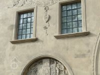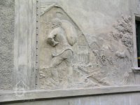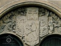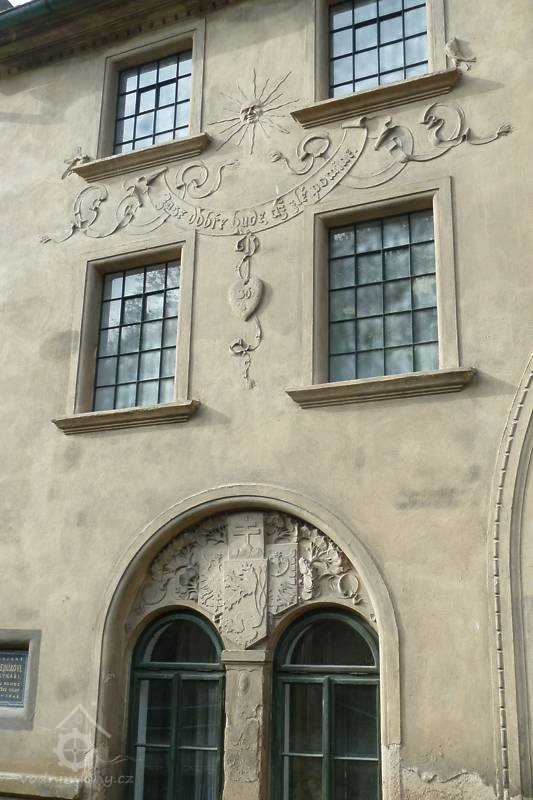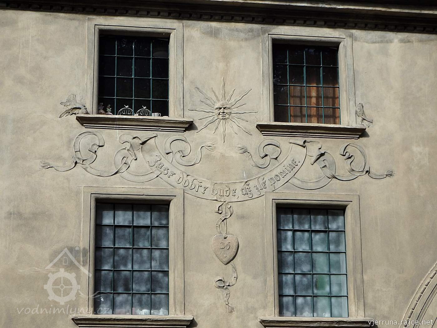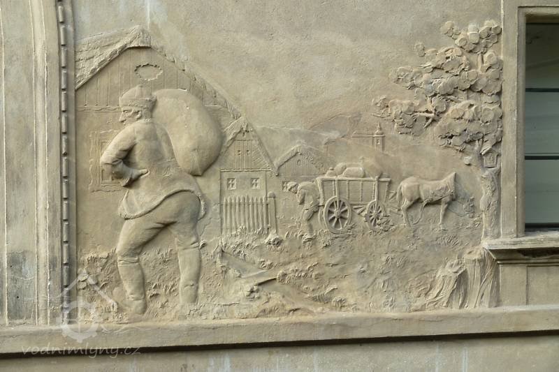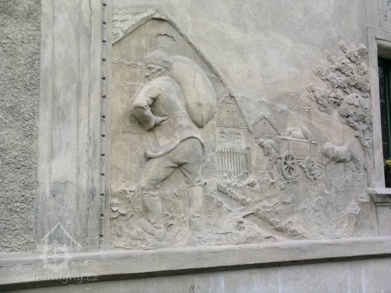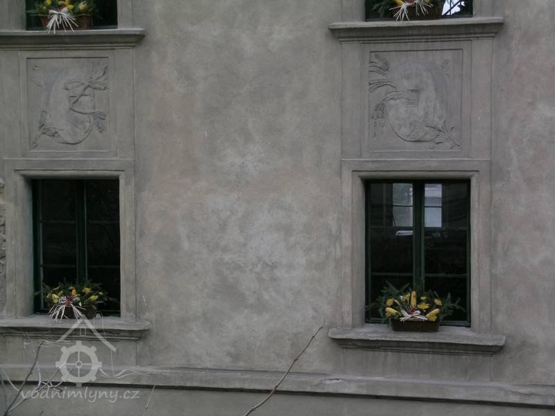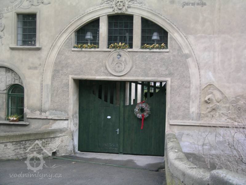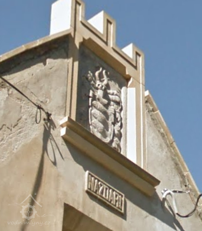 Secesně upravené průčelí, ve štítě erb Žejdliců (tři kapři vodorovně nad sebou), v omítce stylizovaný mlynářský znak, postava sv. Václava a motivy práce ve mlýně.