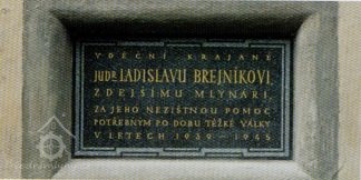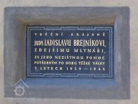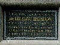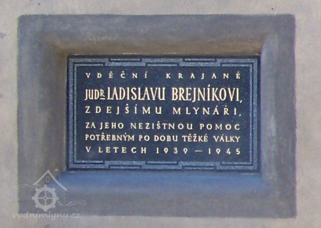 „Vděční krajané JUDr. Ladislavu Brejníkovi, zdejšímu mlynáři, za jeho nezištnou pomoc potřebným po dobu těžké války v letech 1939–1945.“