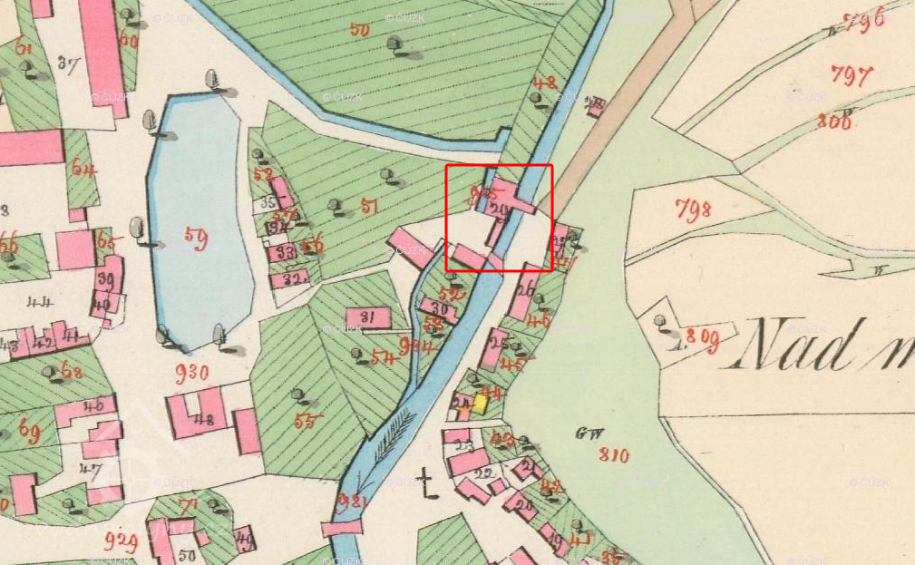 PopisV r. 1930 zde byla Francisova turbína, průtok 0,15 m3/s, spád 5,45 m, výkon 8,5 k.
