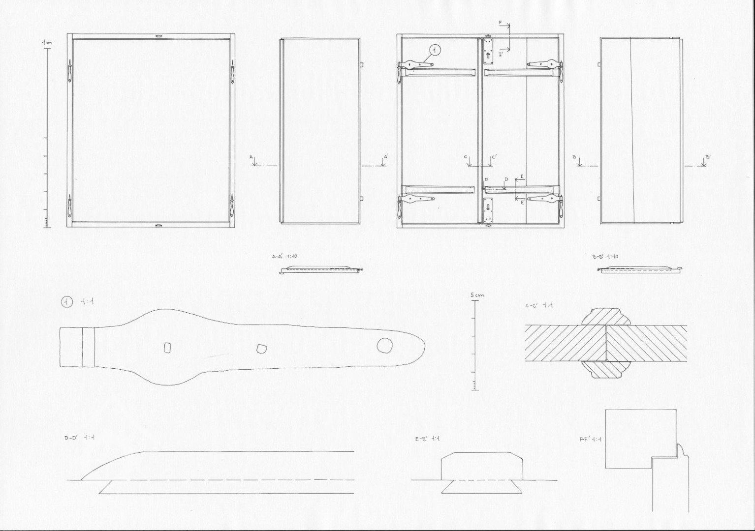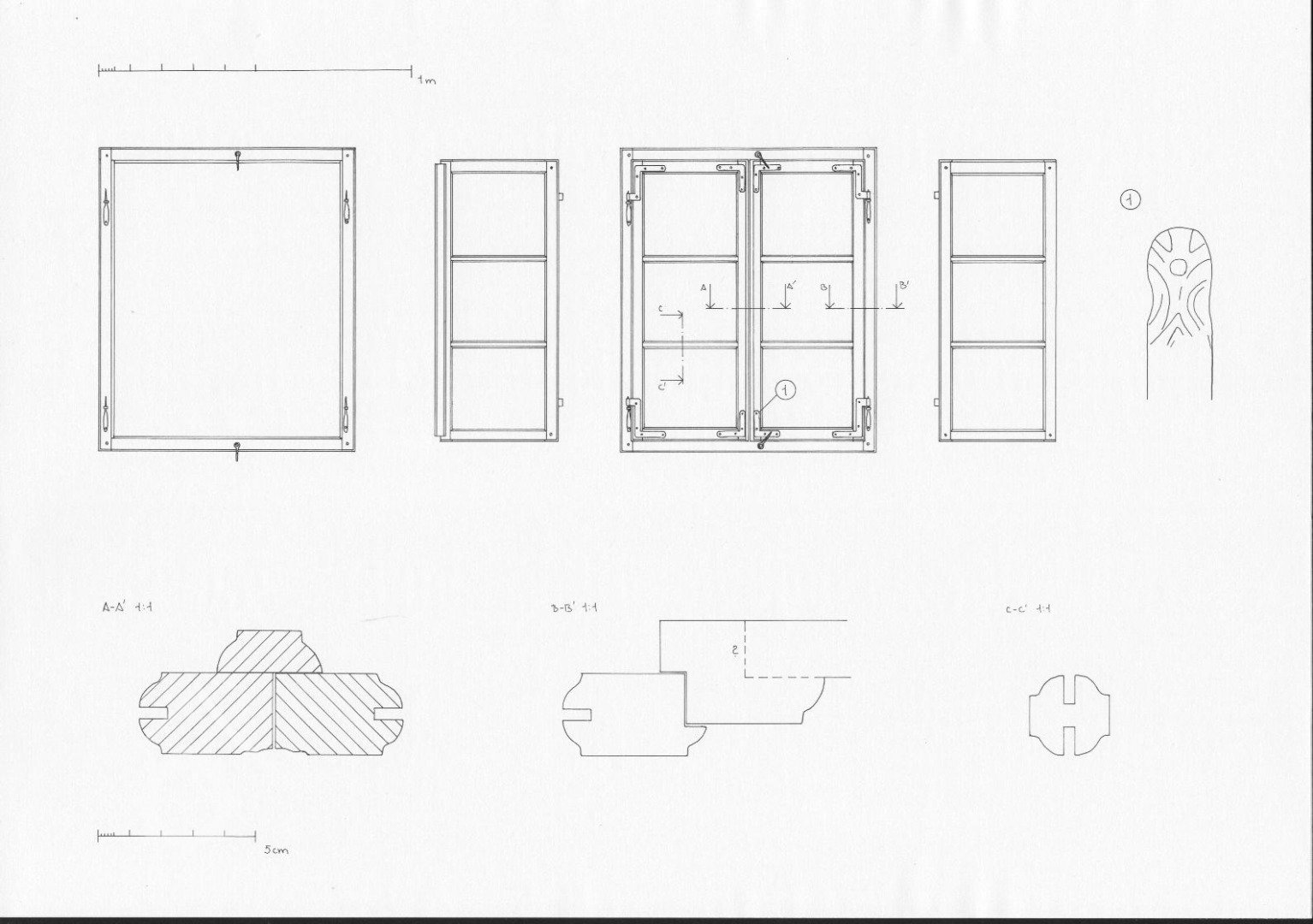 Truhlářské spoje jištěny dřevěnými kolíčky. Zasklení tvořeno pravděpodobně ještě foukaným tabulovým sklem (nerovnosti, bublinky) do drážky bez použití tmelu.