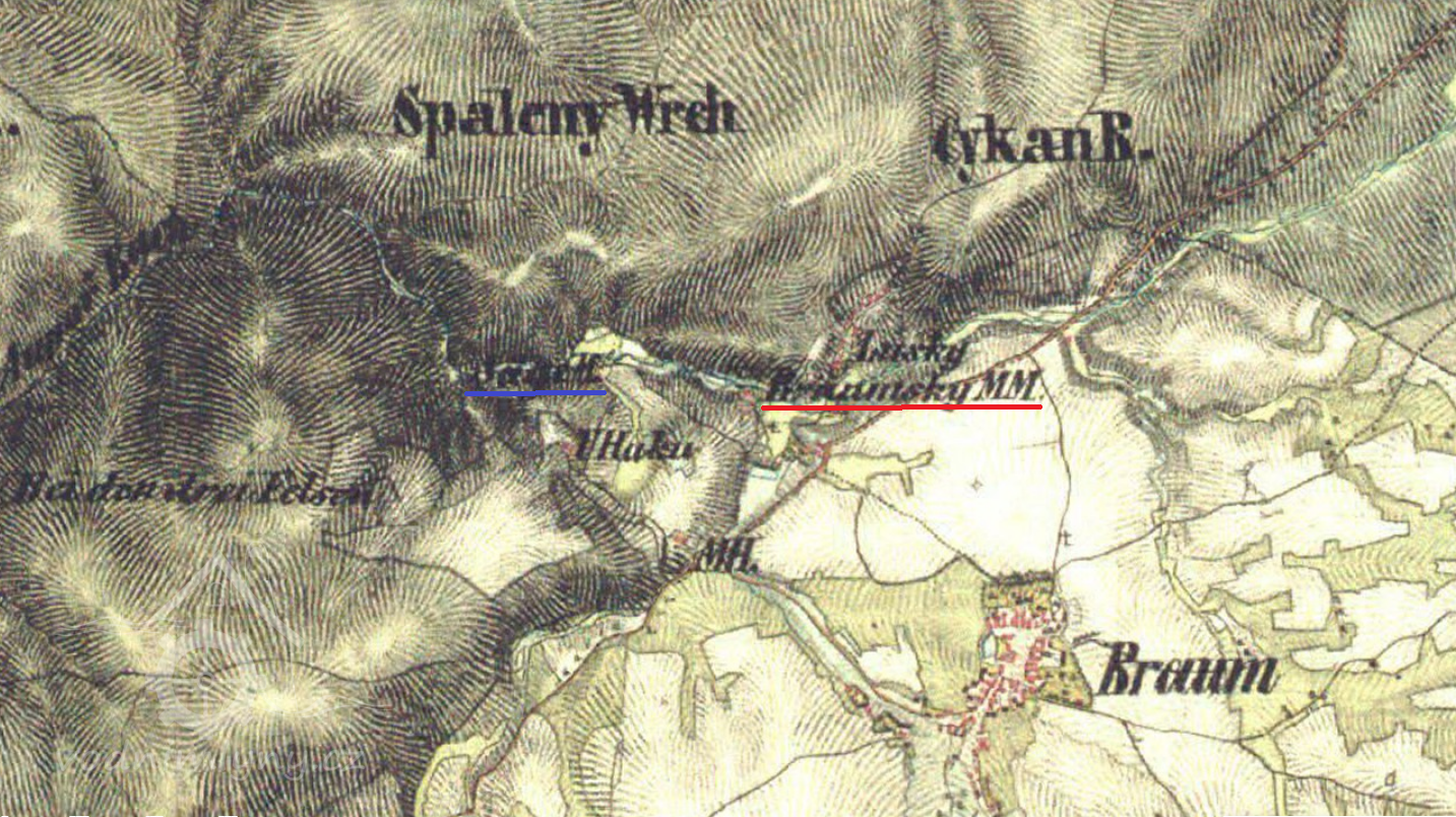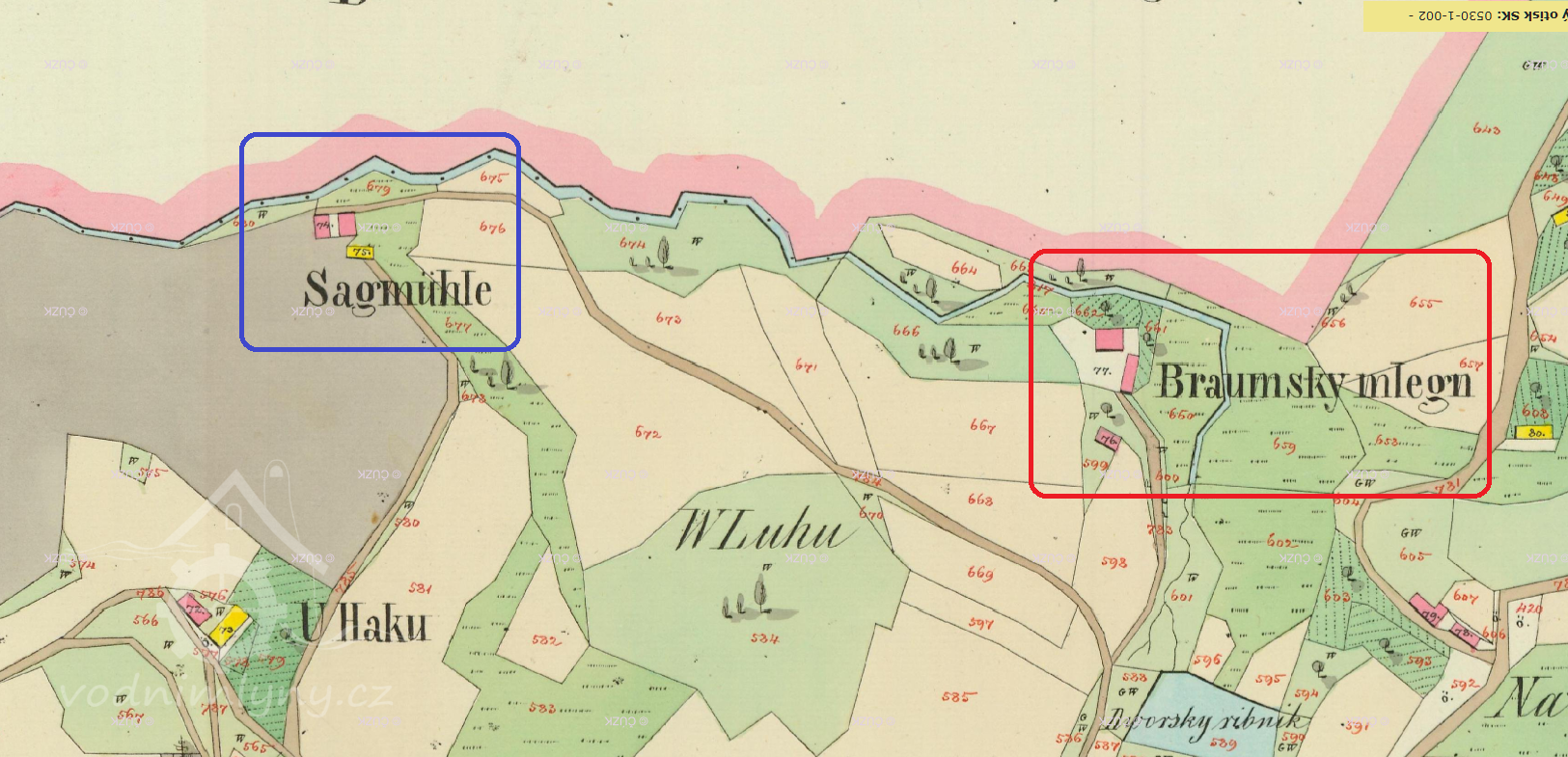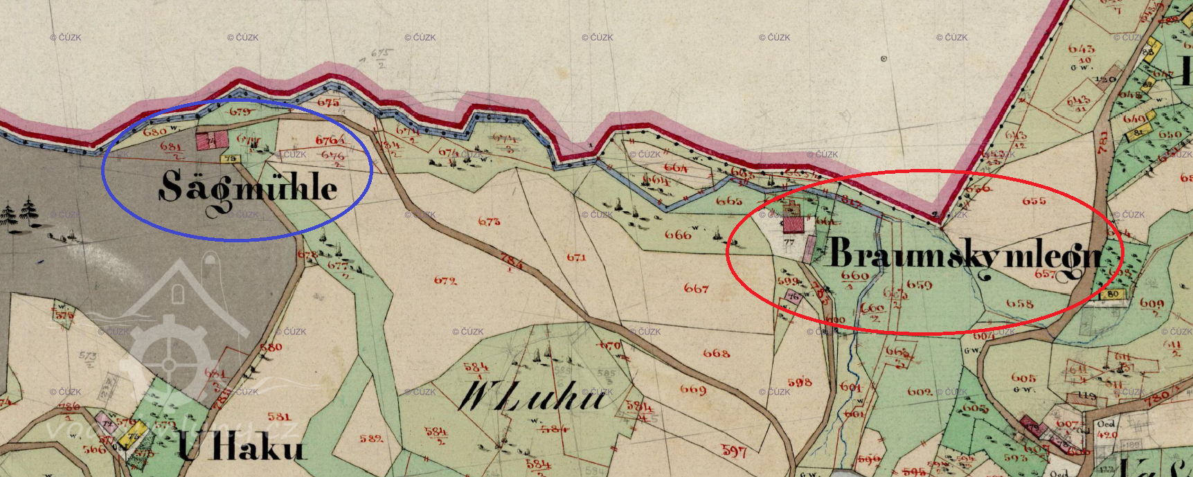 Původně pila náležející k Broumskému (Hořejšímu) mlýnu čp. 40, po pol. 19. stol. samostatný obilní mlýn, 1930 již nebyl v provozu.