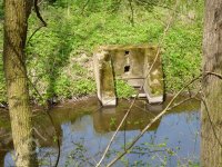 jeziště patrné se zbytky rovnaného kamene na březích, zbytky přepadu u stavvidla, náhon zasypán ale stále patrný (TK, 2023)