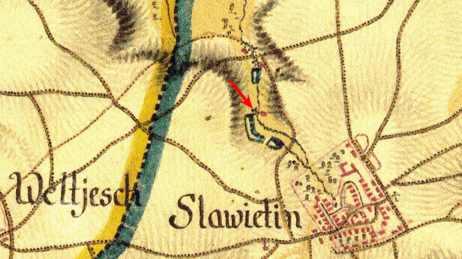 Mlýn se nacházel asi 1200 m SZ od kostela sv. Jakuba Většího ve Slavětíně, u Hořejšího rybníka.