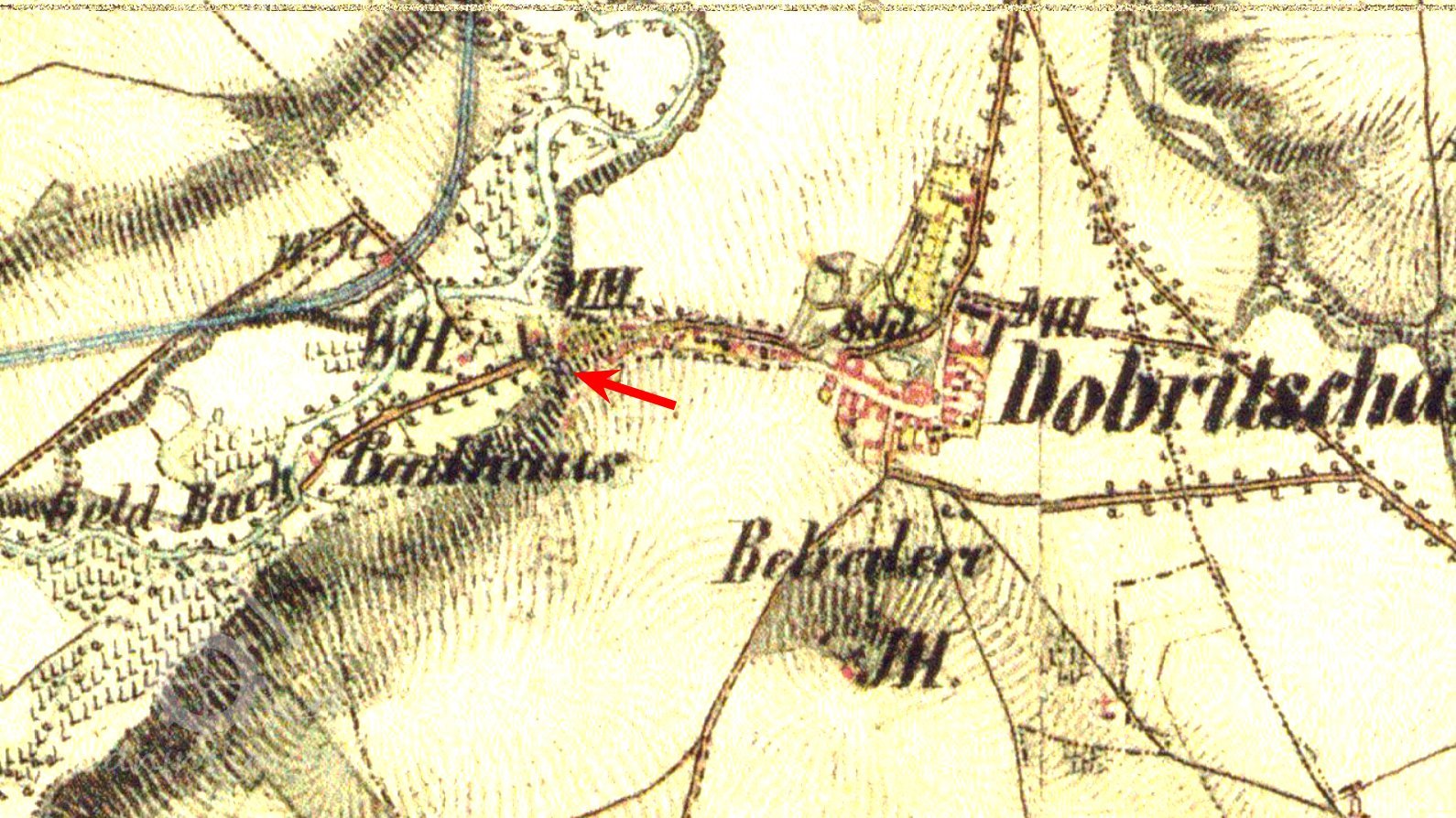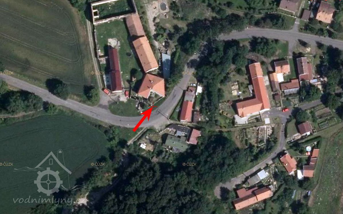 Mlýn se nacházel asi 500 m Z od dobříčanského zámku.